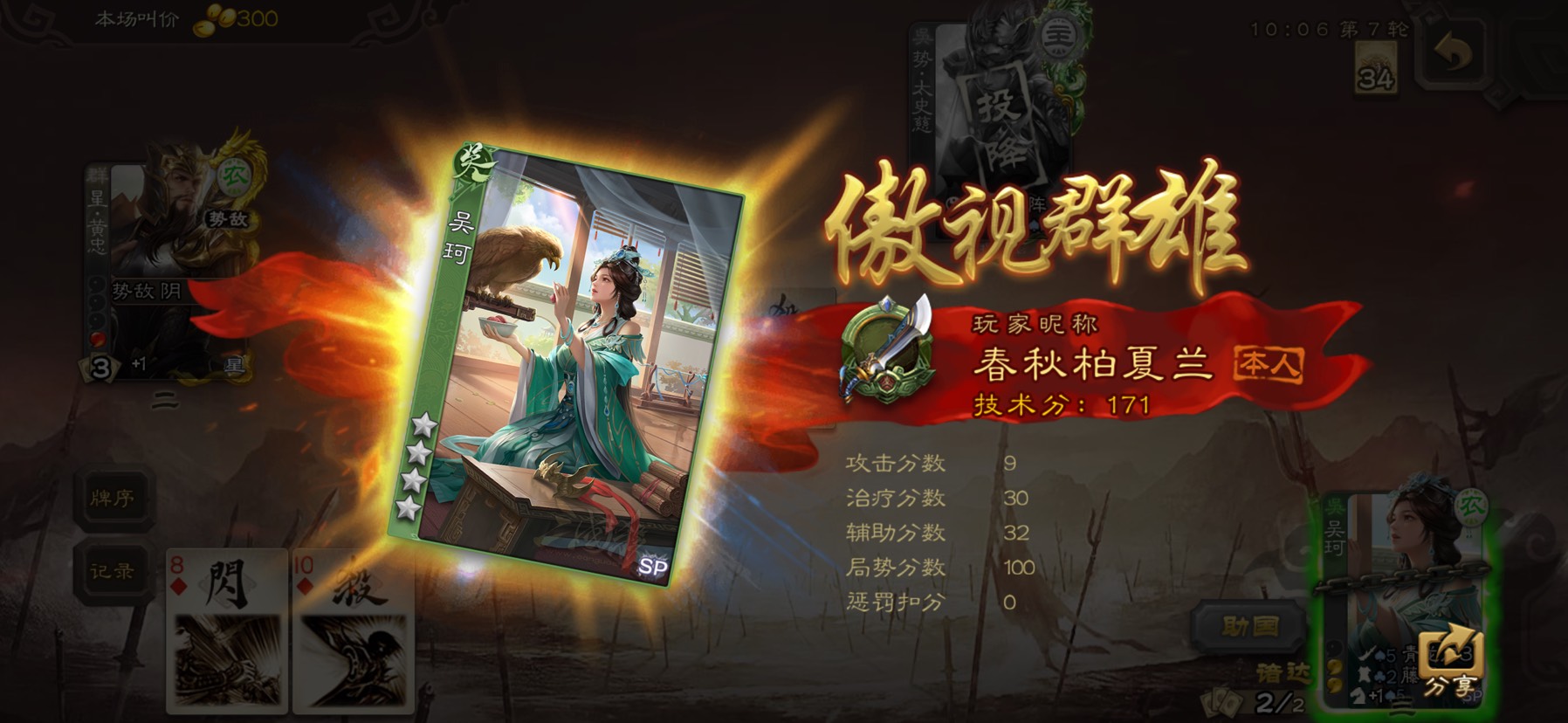 结果这星黄忠每回合有我补牌,卡不住绿太距离就算了。