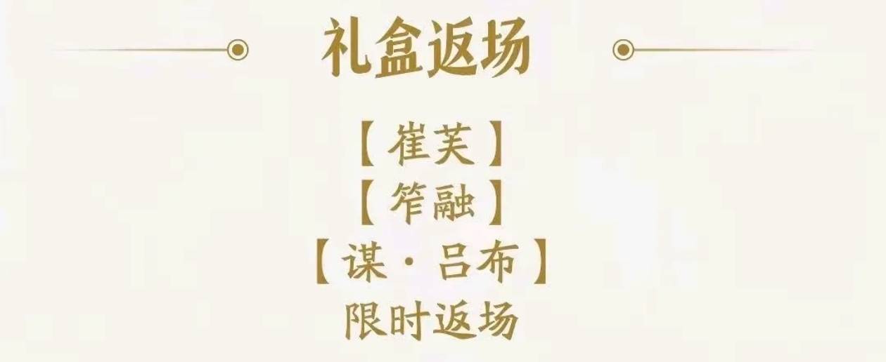 本周有三个史诗武将塞进礼盒返场,分别是崔芙、笮融、谋吕布,属于二线史诗选手,其中玩军八的杀友建议拿下崔芙,其余俩没有获取必要,估计三个武将会塞进一个礼盒。