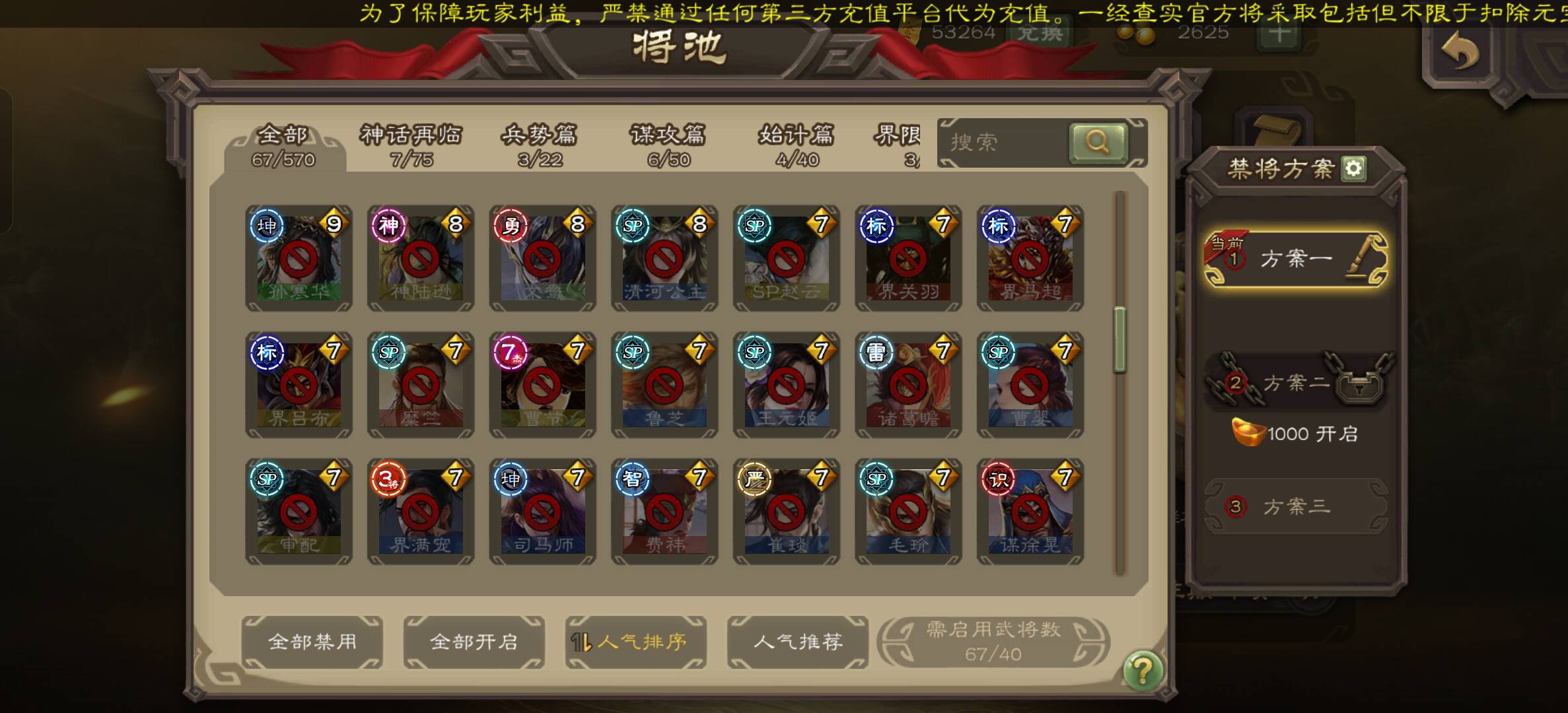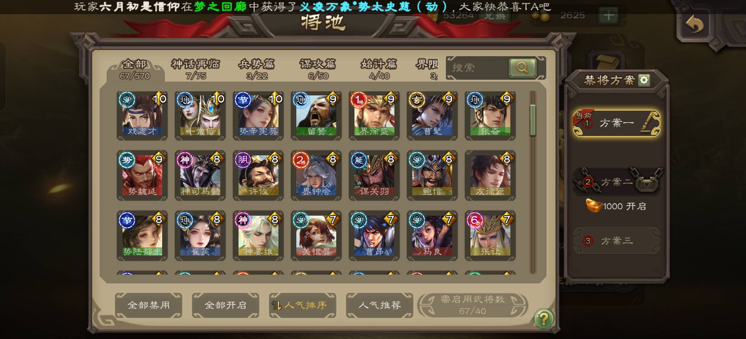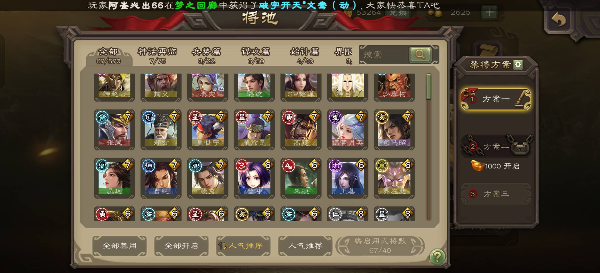 留戏子,十常侍,辛姐,曹髦,势魏延,崔姐,神姜维,要是开将数不够或者觉得经常炸框可以选择开牢大,谋关,友徐庶,橘子,其他全关了