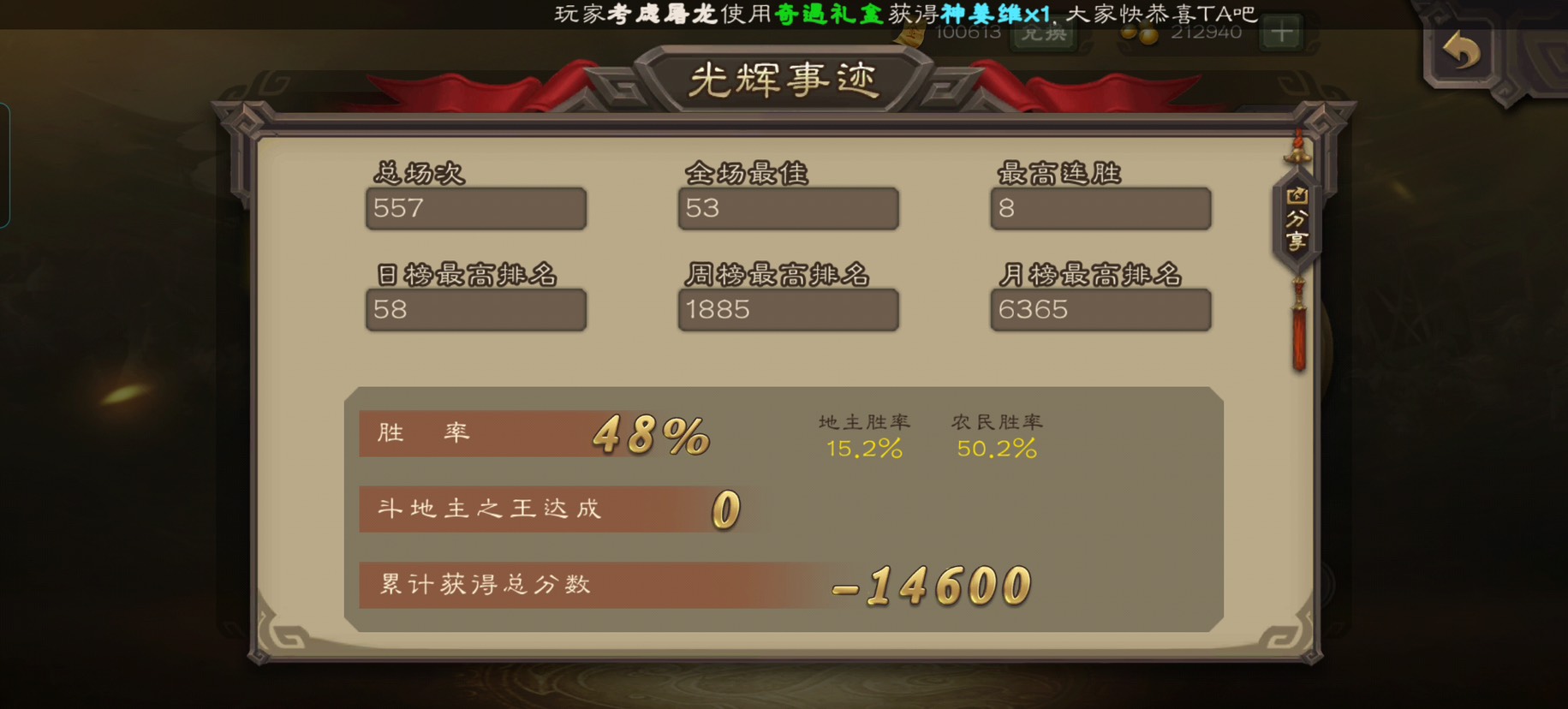 来自版块:三国煮酒从七号到现在,硬扑了斗地主打了两百多把终于凑到十万了,将军们太不容易了,真的高倍出奇迹!也是终于要凑到十万金票的时候才发现地主一把赢一千八,这也太快了吧?