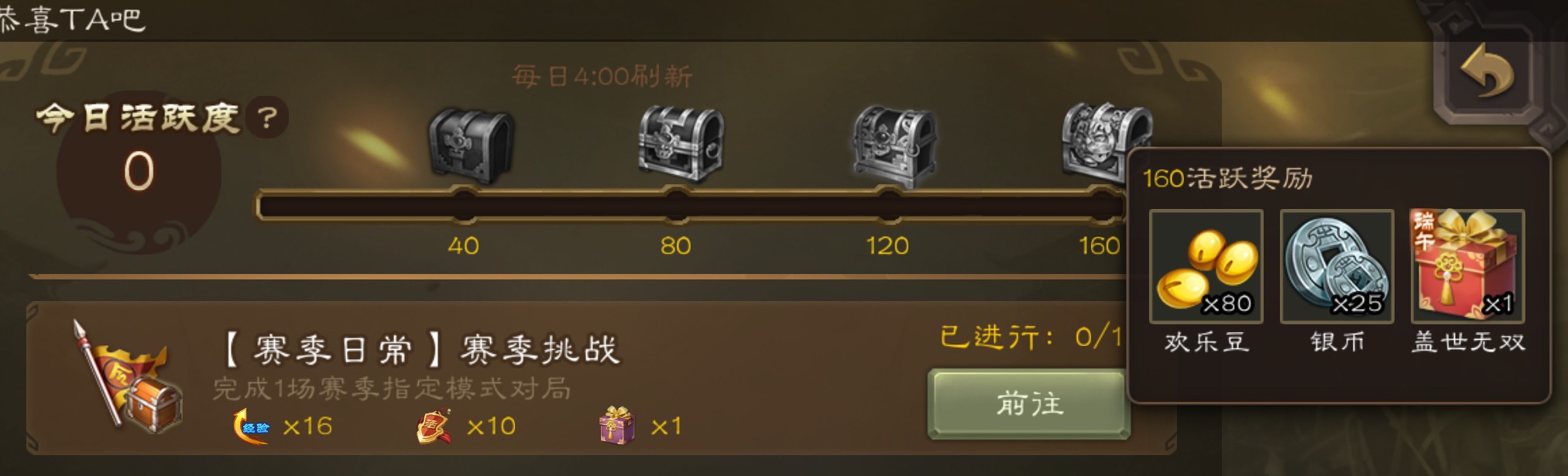 2,日常活跃度,这个160活跃很快,打几局就行了,可以顺带把赛季日常盒子拿下,这就是2个盒子,一周就是14个盒子