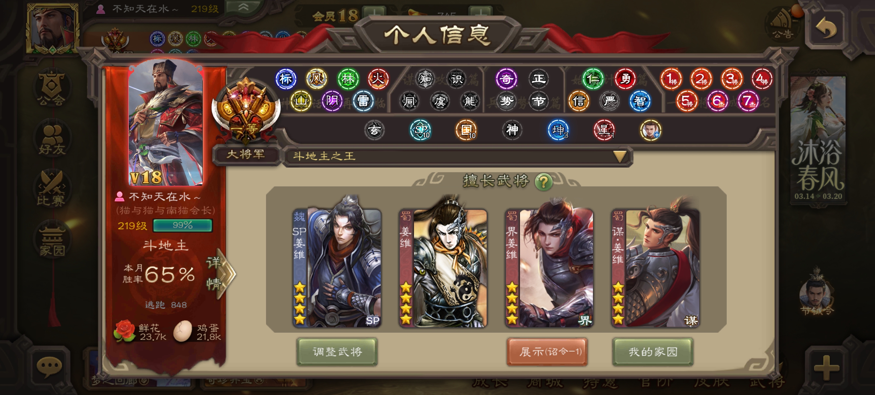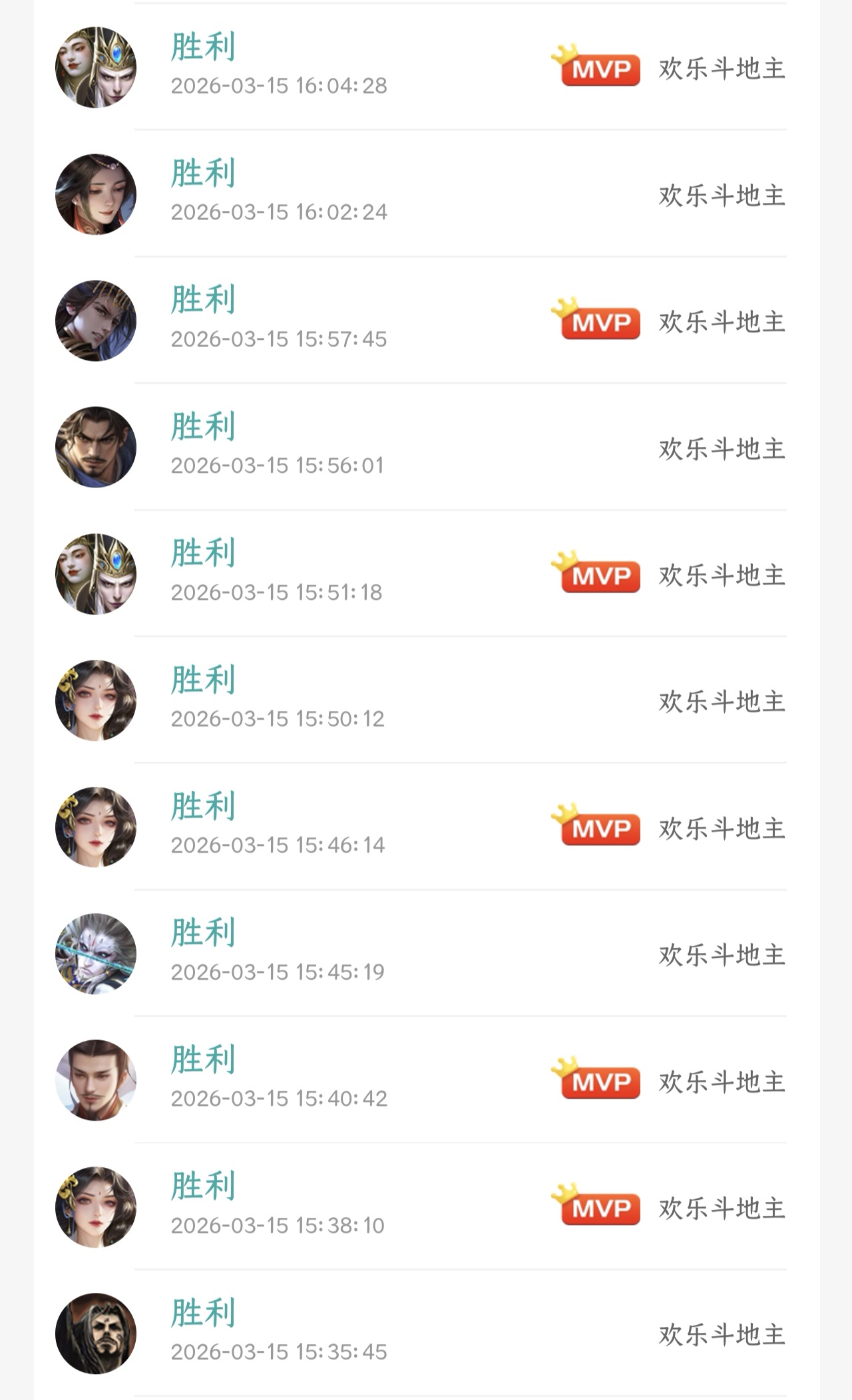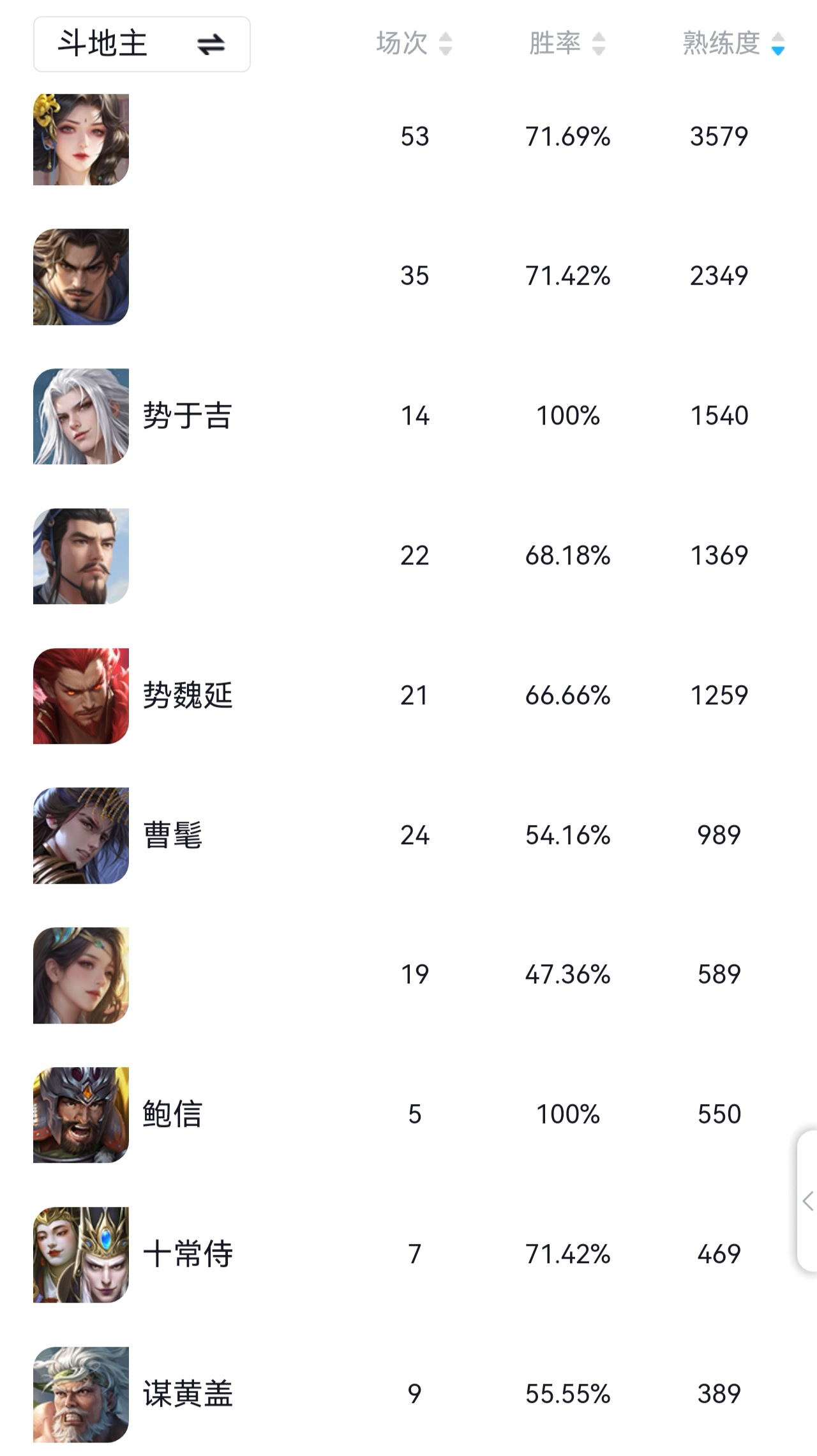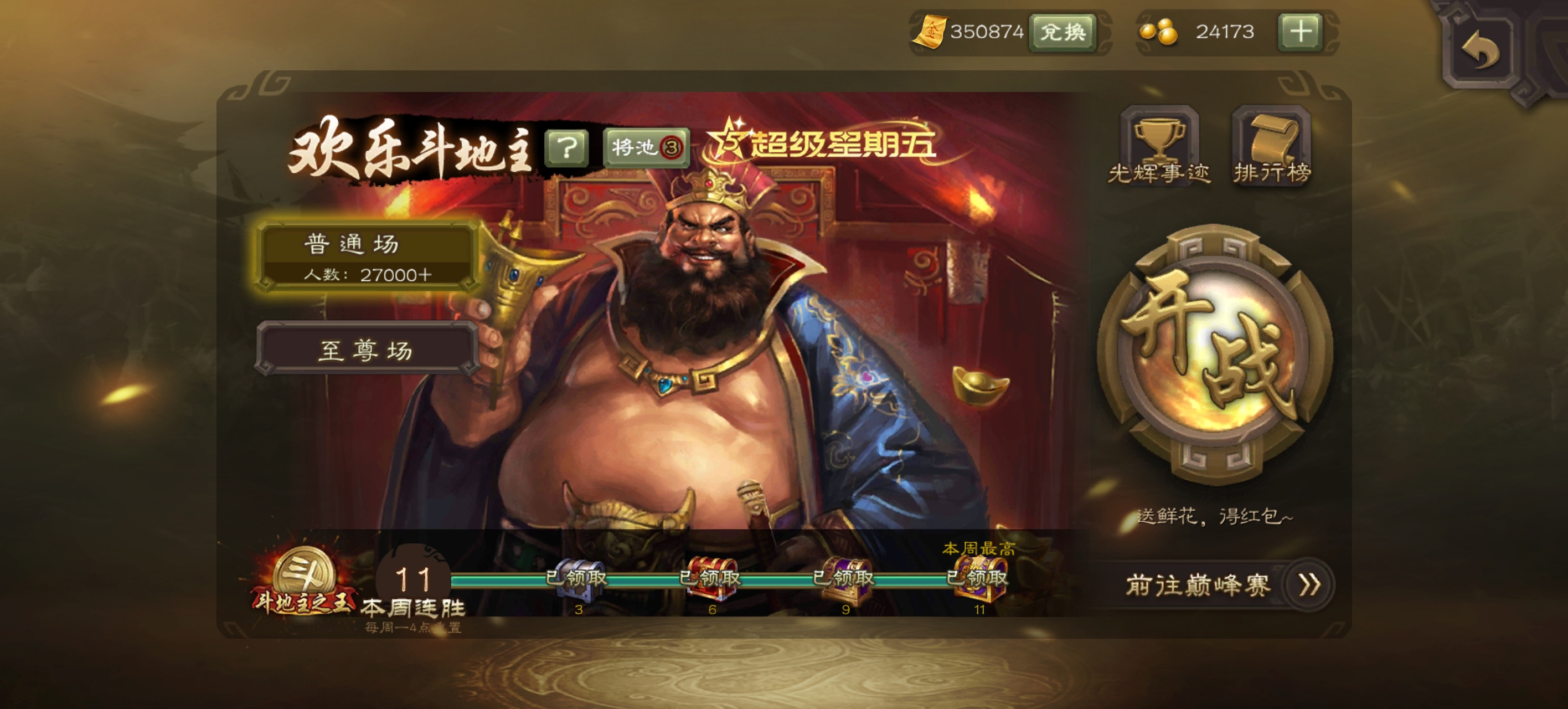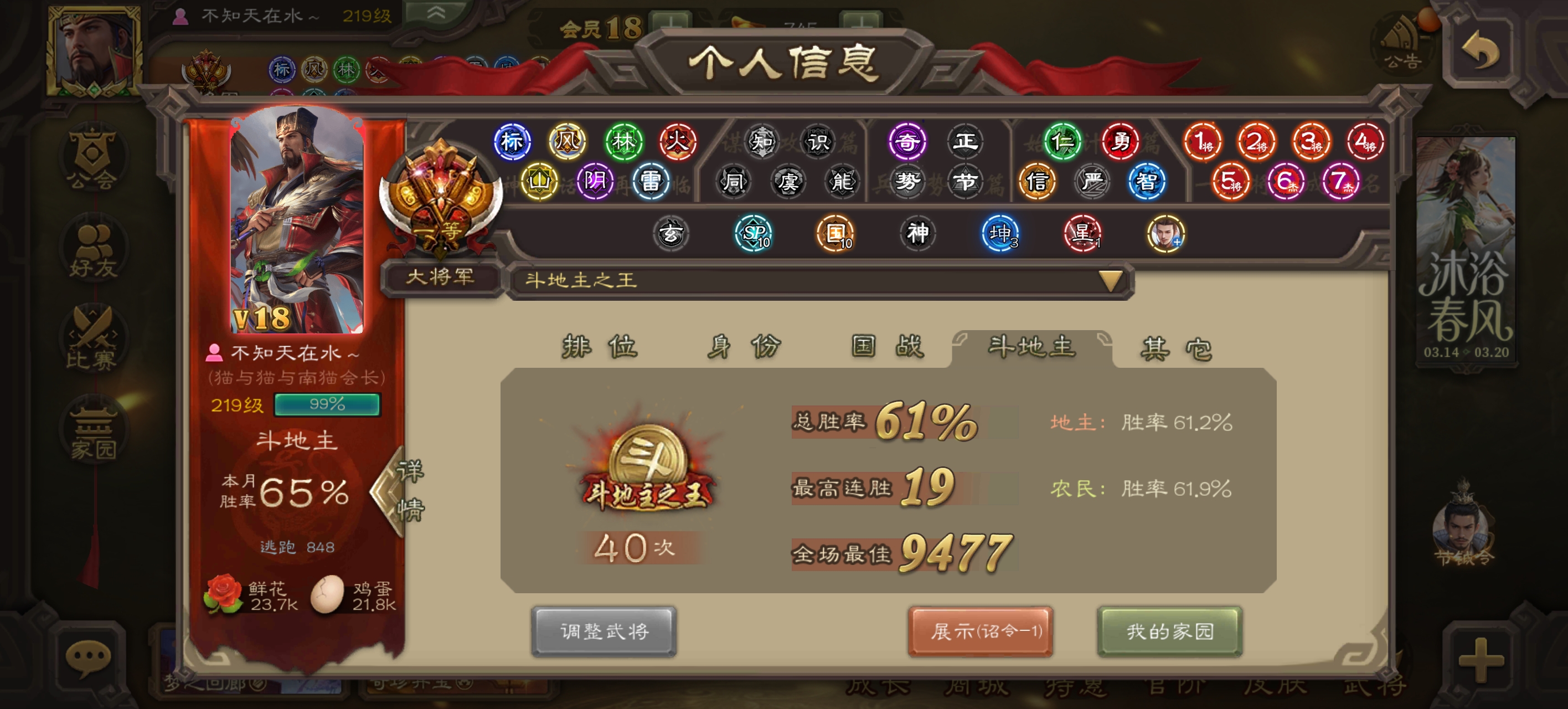 之前已经连续12周斗王了(前7周纯农民禁将+后5周正常地主禁将)。这周正常地主禁将,先是在周五顺利11连胜(4把地主,7把农民)拿下第40个斗地主之王,今天周日又再次11连胜(3把地主,8把农民)拿下斗王,也是本周第2个斗王,可惜只累计1次。同时也是连续13周拿下斗王,一共25次(2+1+2+5+3+1+1+2+1+2+2+1+2),实际计入13次。今天有一把火龙果极限拿下神姜维和星董卓。目前27682场总胜率61.72%,地主胜率61.2%,农民胜率61.9%,月百场胜率65%,累计40次斗王,天水第一名仕,主页四姜维。目前最新地主禁将放在最后,五排强开伪全扩号一样能玩的很舒服。