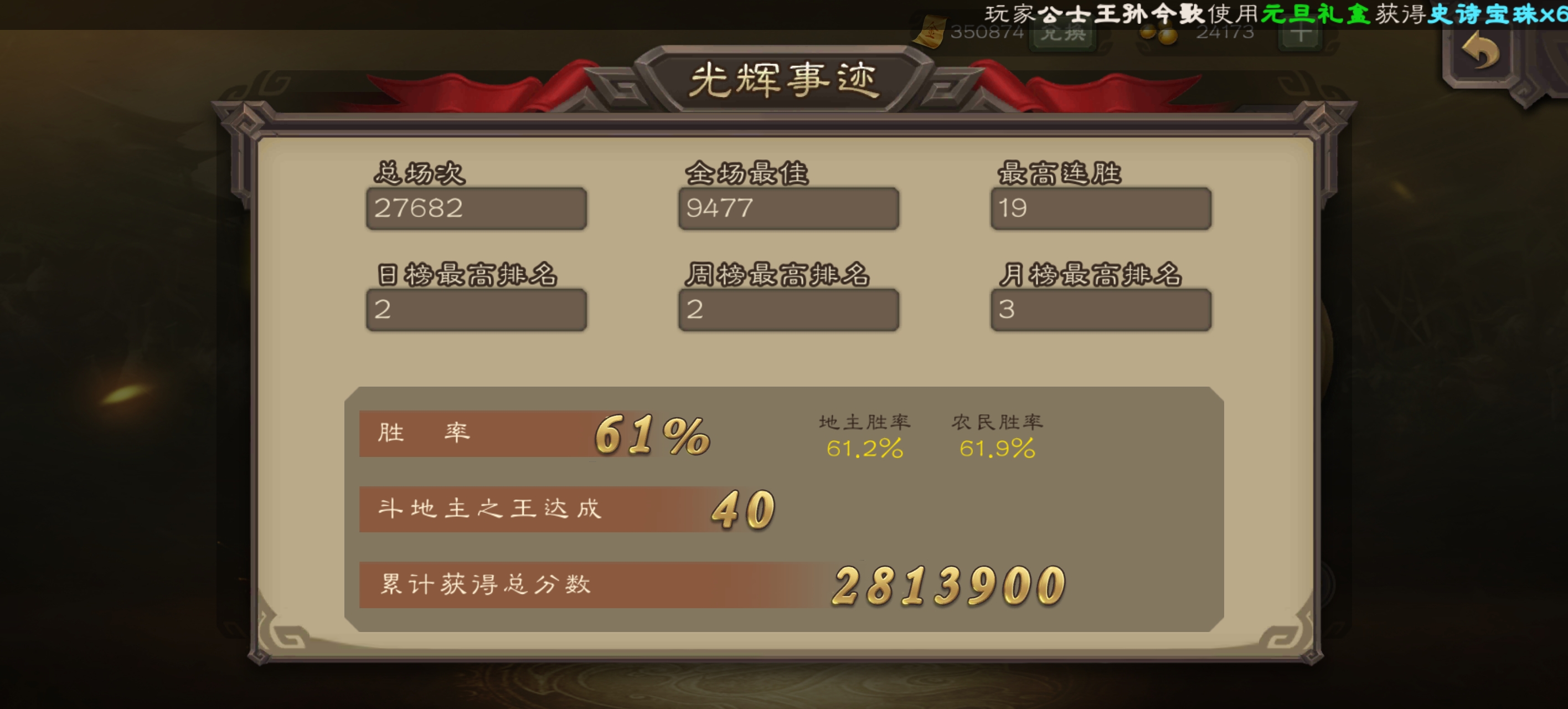 地主禁将11连胜拿下本周第2个斗王,可惜只累计1次,总胜率61.72%