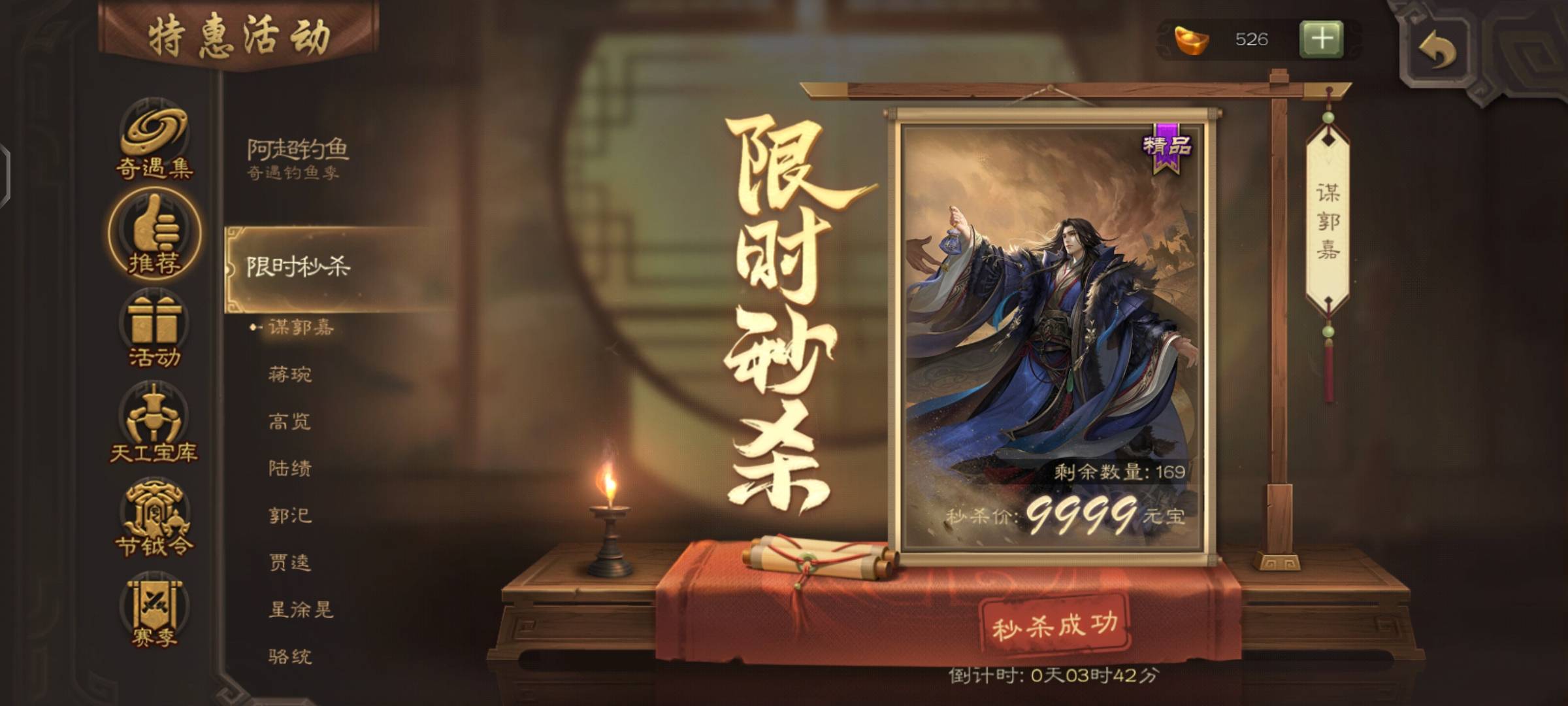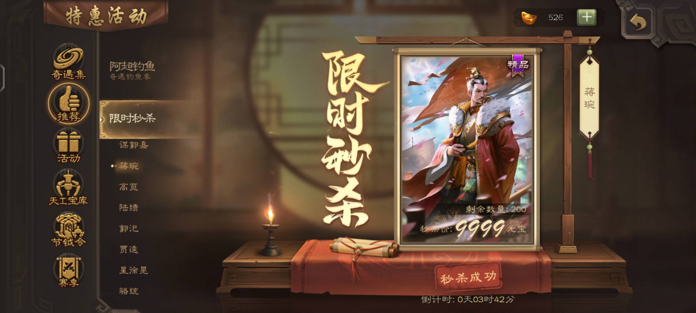 没啥盼头了,八点十五分换了三个武将,再买个盒子,得三颗珠子,碎了,开出来一颗珠子,又碎了,游戏定义就是有到无,是种乐趣吧。八点二十分郭嘉没了,蒋琬还剩五十八个,这么抢手?