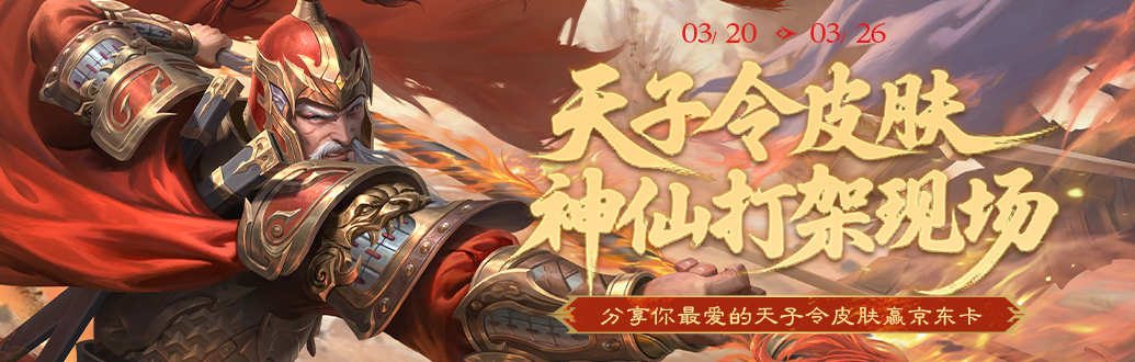 3月20日到3月26日,带上话题 #天子令皮肤神仙打架现场 ,发布原创内容,形式不限,有爱就行!投稿得1000咸豆,随机抽取5位主公获得运气奖50元京东卡,优秀内容还有机会额外获得50元京东卡~