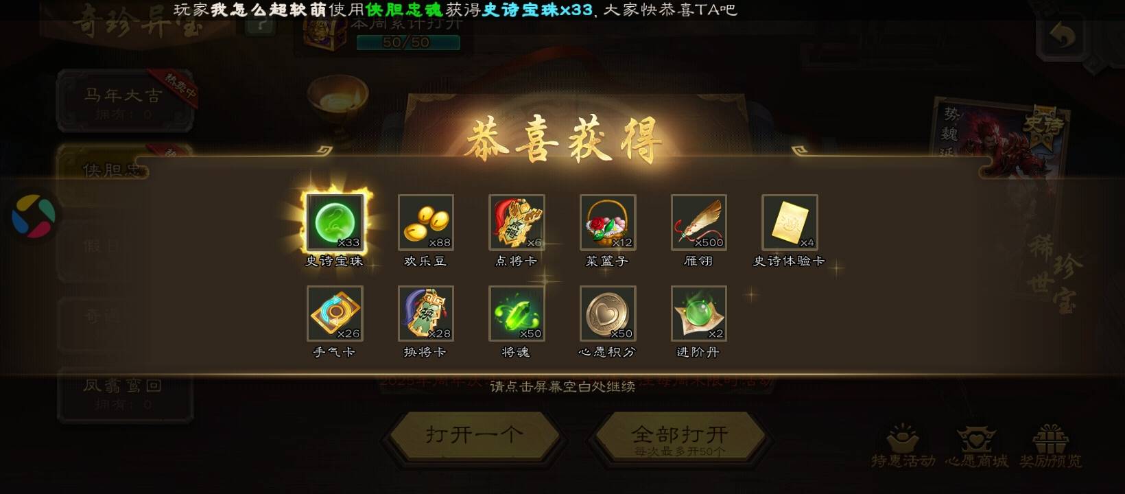 66宝珠已经变成我的一个执念了,之前换了势魏延到现在没有一个月,想着开点盒子看看能不能重复势魏延原自己一个66梦(一个月内全额反),毕竟魏延万分之一的概率重复反66就相当于双倍概率了而且盒子半价,结果权一是出了但是歪33了有点难受,不知道要猴年马月才能出66。