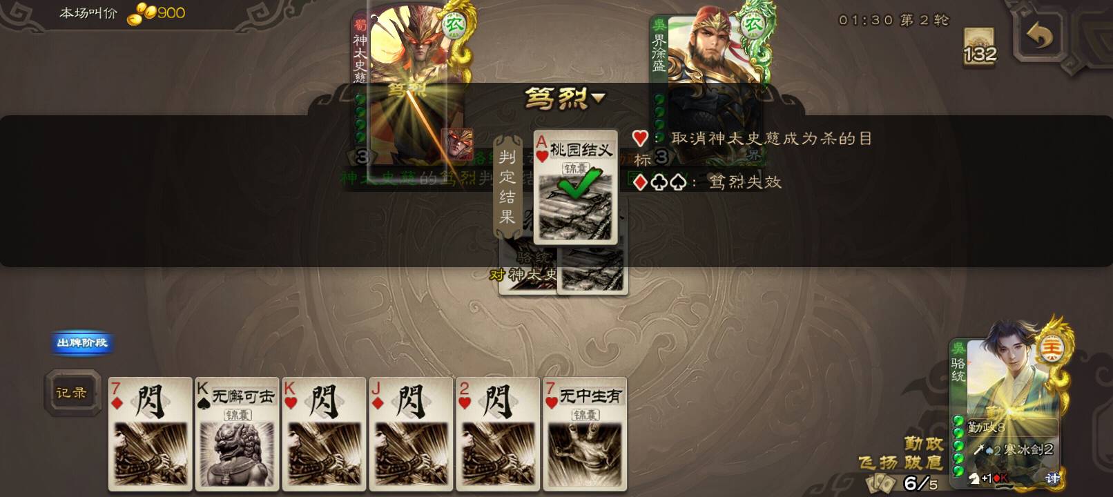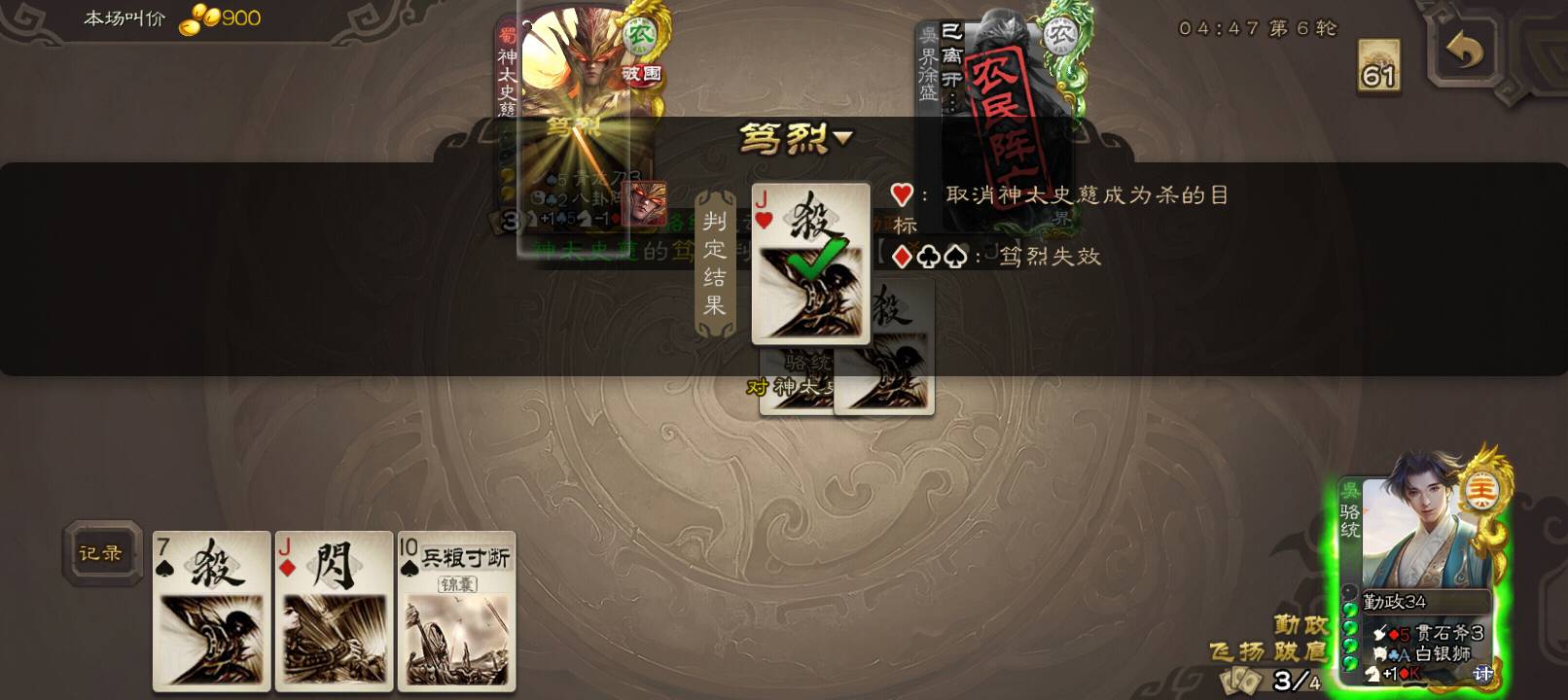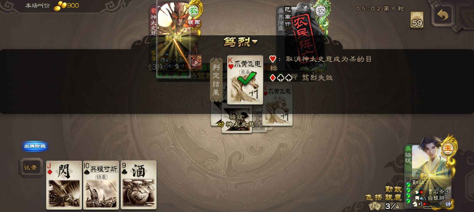 最近就没靠乐不思蜀赢过一把游戏,对面的天过概率是100%。没招了,只好死了。#日常 大展红图好吧。我杀神太一直在那判红桃。对面八卦就八门金锁,我的就属于有和没有一样,真是好极了。破APP上传图片又卡,就先上这几张吧,闹麻了。两刀给诸葛砍满血了,气笑了。这游戏bug真多。赢了还要砸我嘲讽,是没赢过吗?