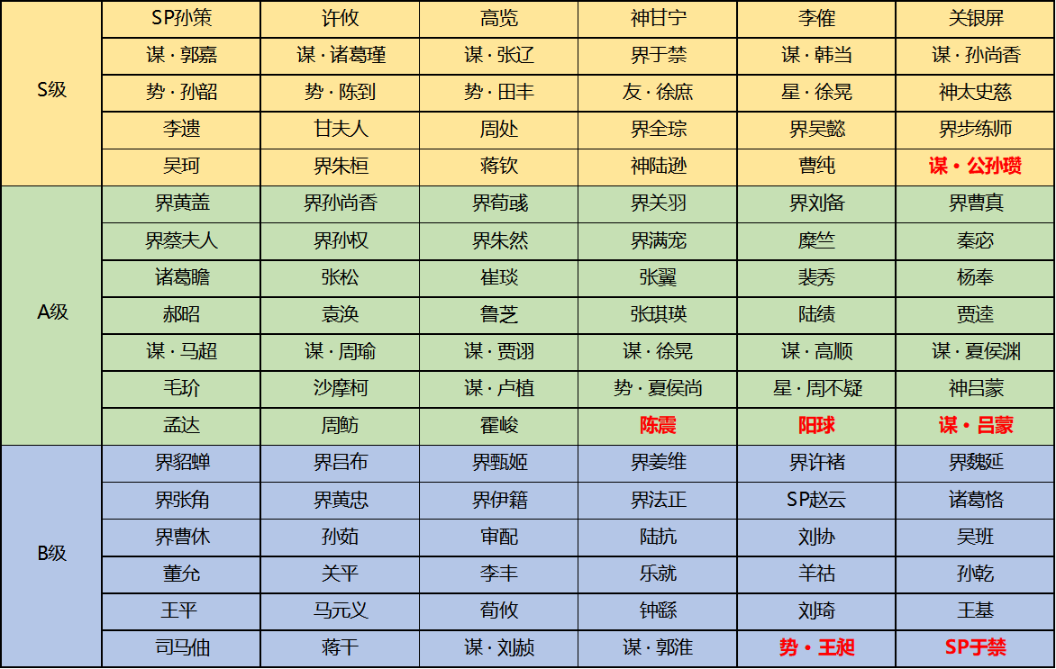 每位玩家均可以使用将池中的武将,在选将阶段开始前,双方队伍中的一名玩家可以禁用对方2个武将。本届赛事将池新增谋·公孙瓒、阳球、SP于禁、陈震、谋·吕蒙、势·王昶,具体将池如下: