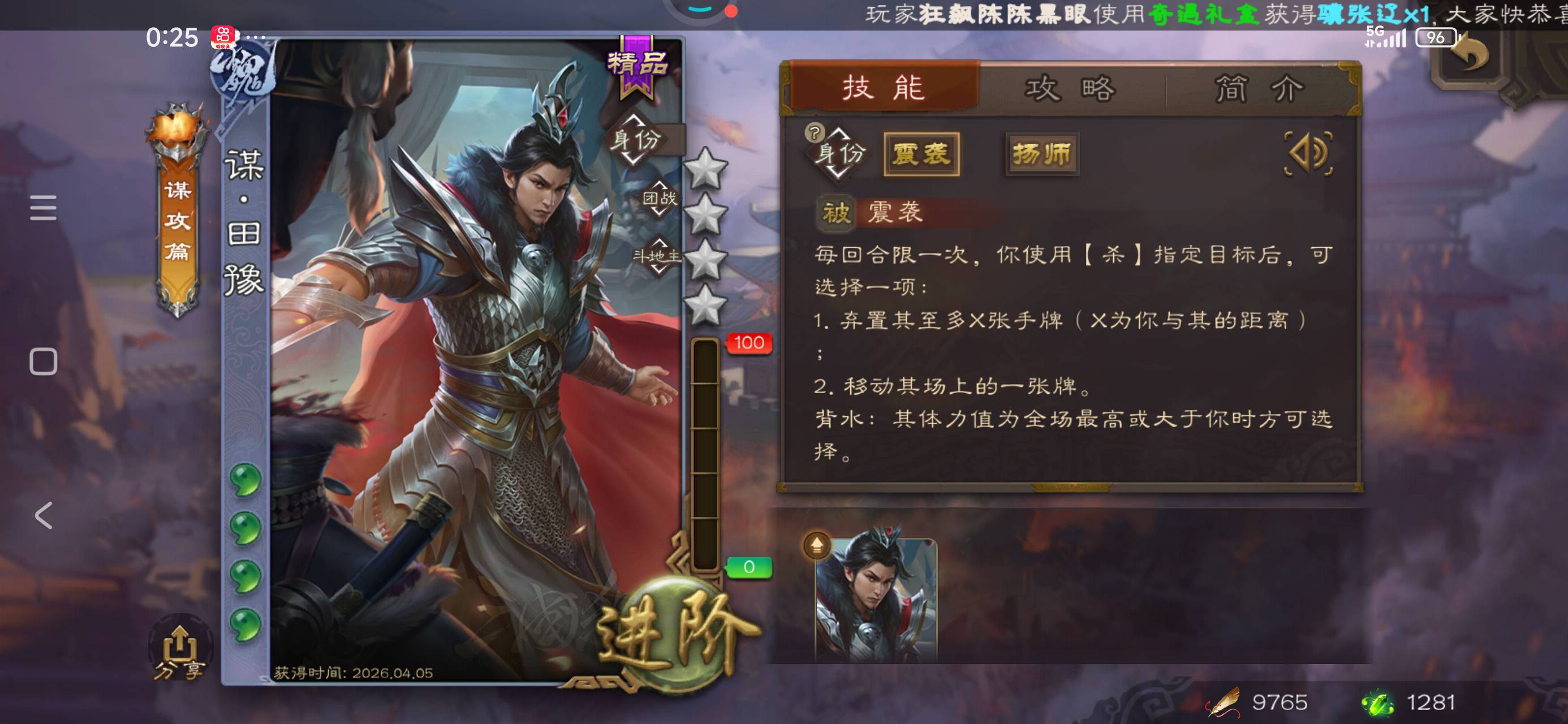 如题,今天顺利再次打上大师,拿到了新的大师武将谋田喻,具体强度目前还不清楚,但排位显示7分,应该还是要比乐就和sp于禁要强不少。