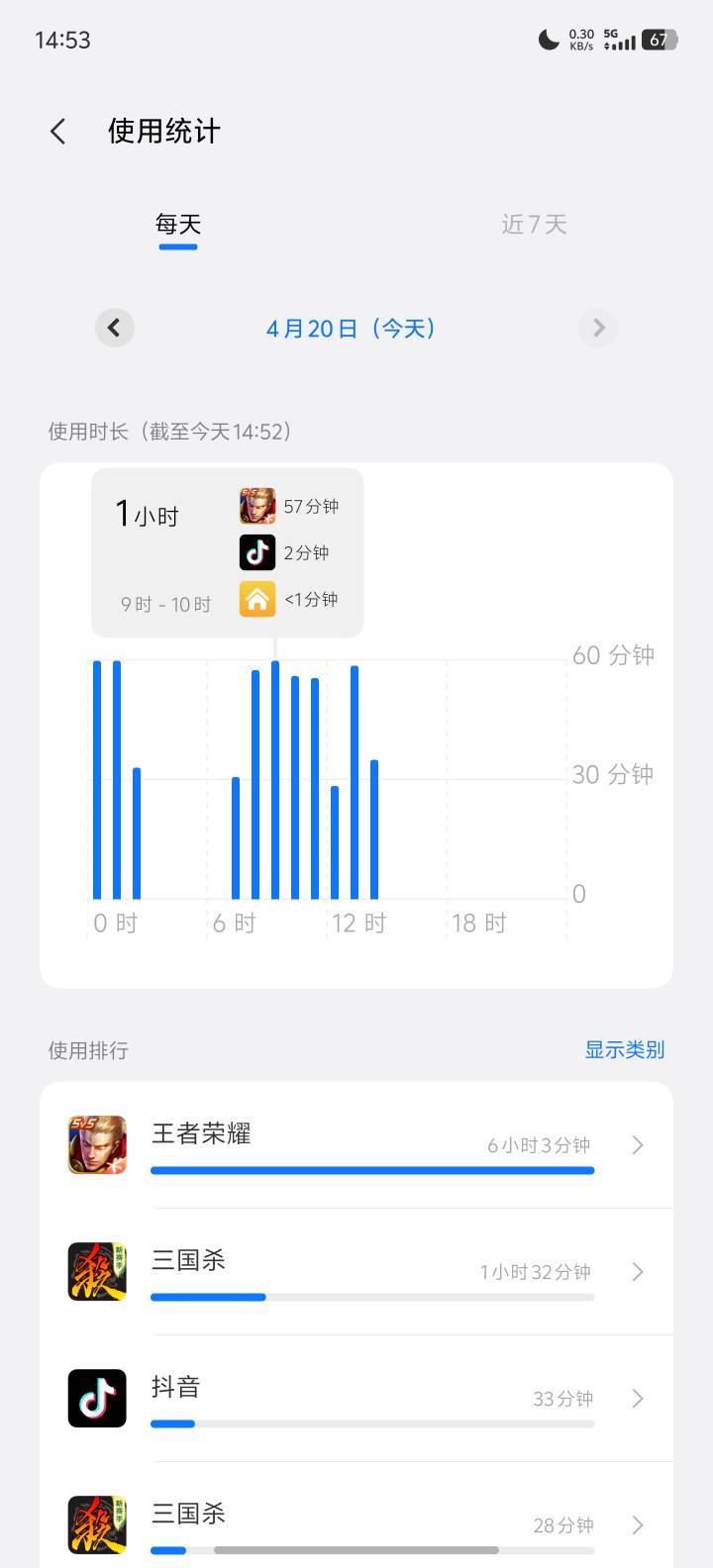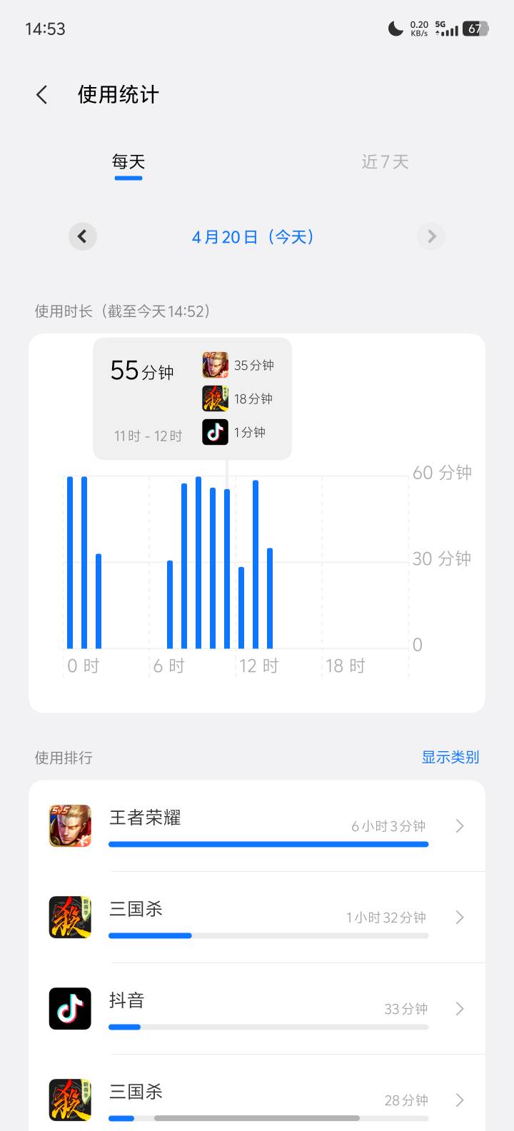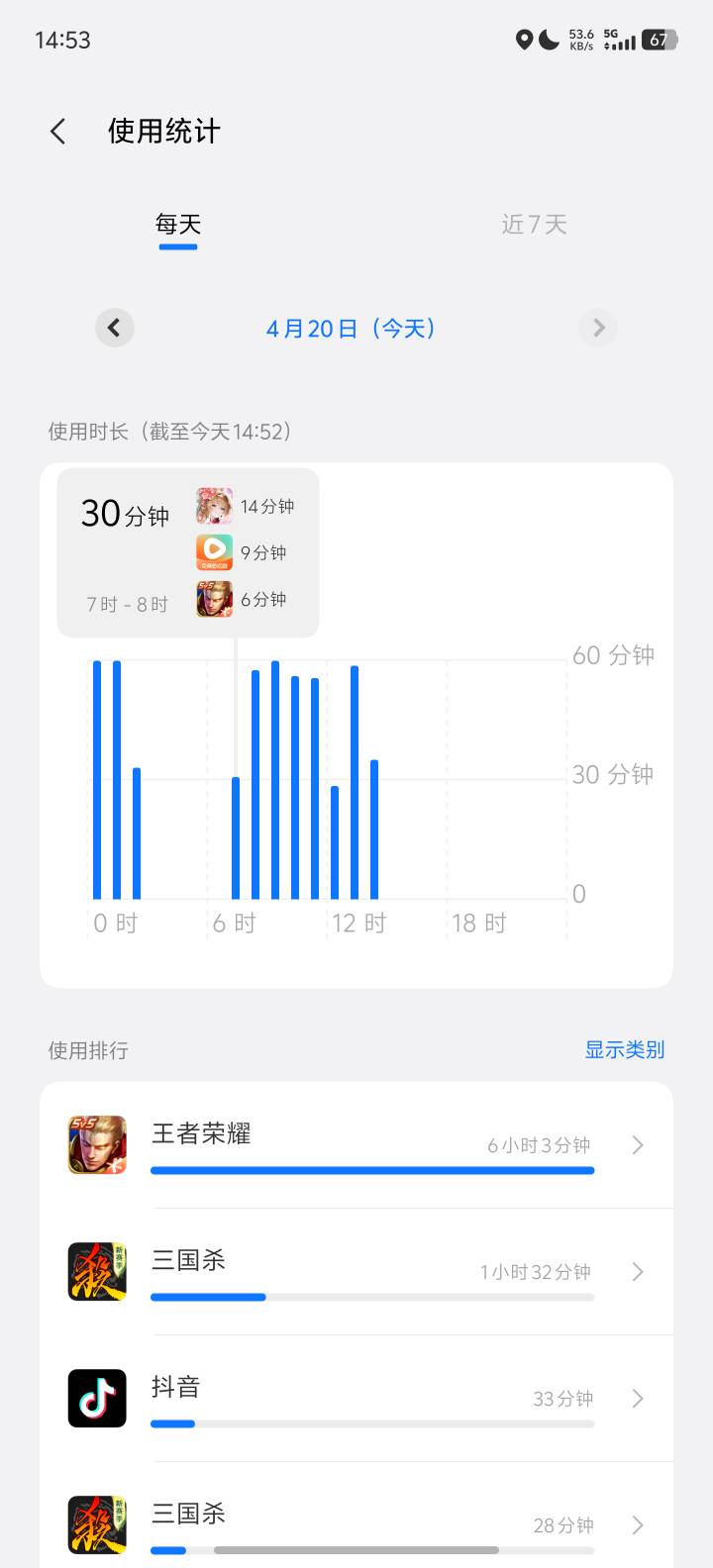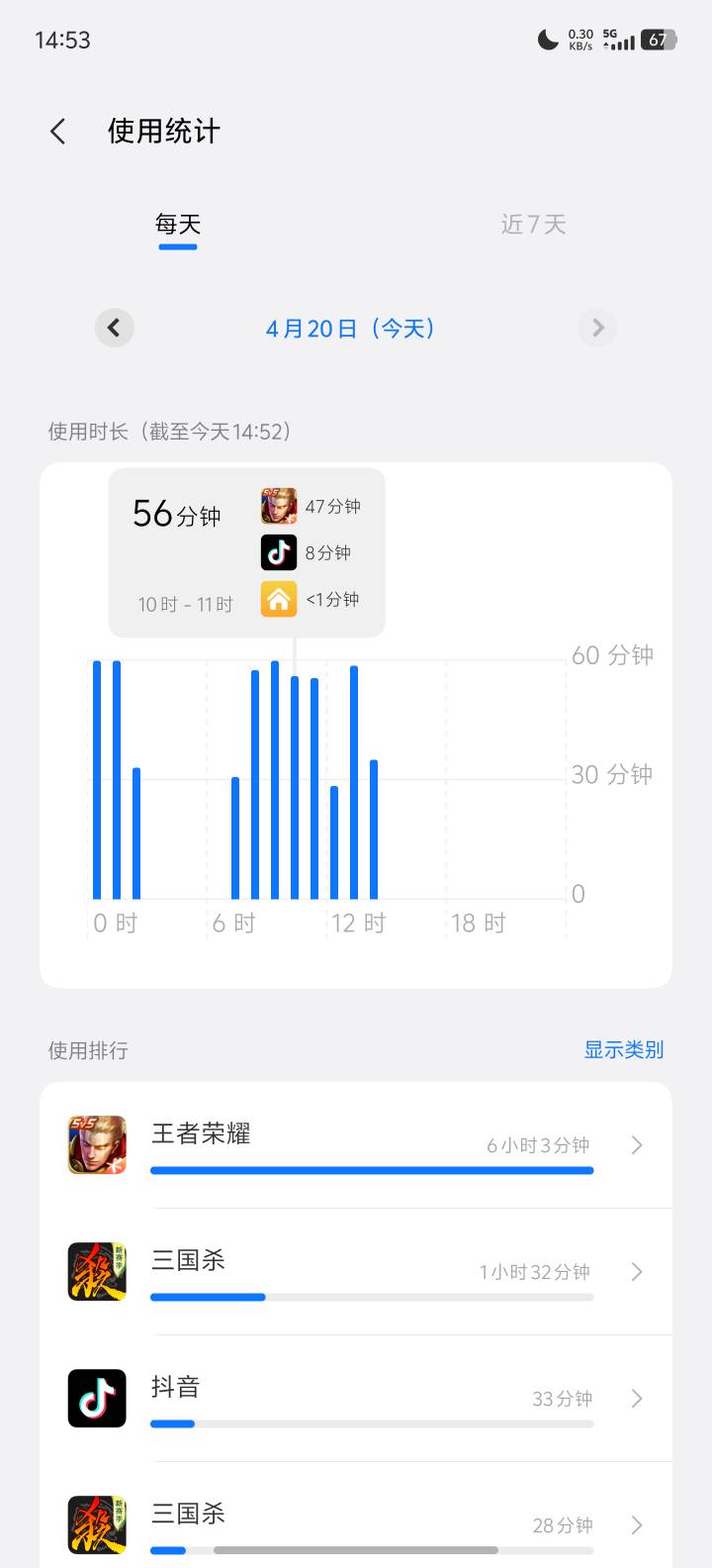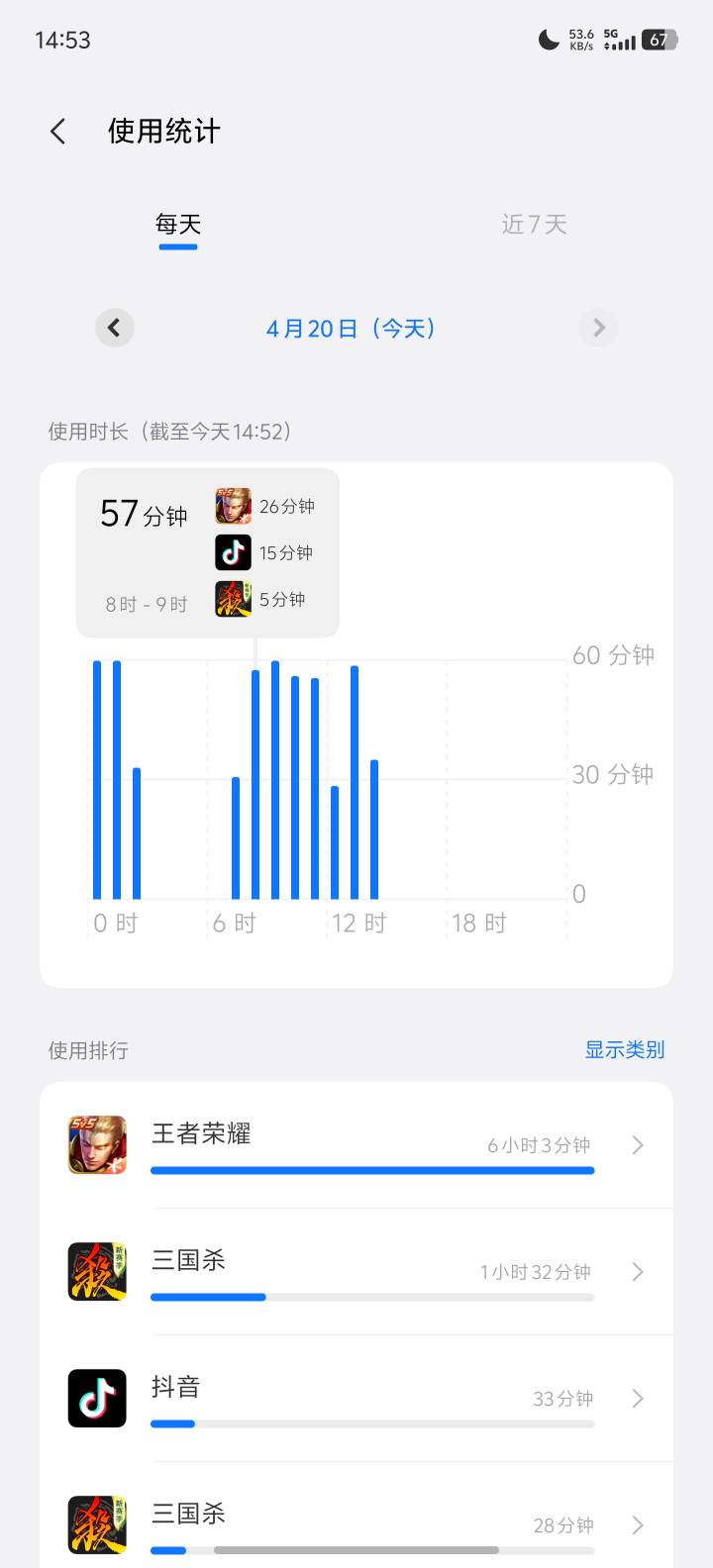 7点半干到11点半,我也是7:25起来,给你们看看我玩手机的时间,一共是240分钟玩手机玩了232分钟,一小时15.3米