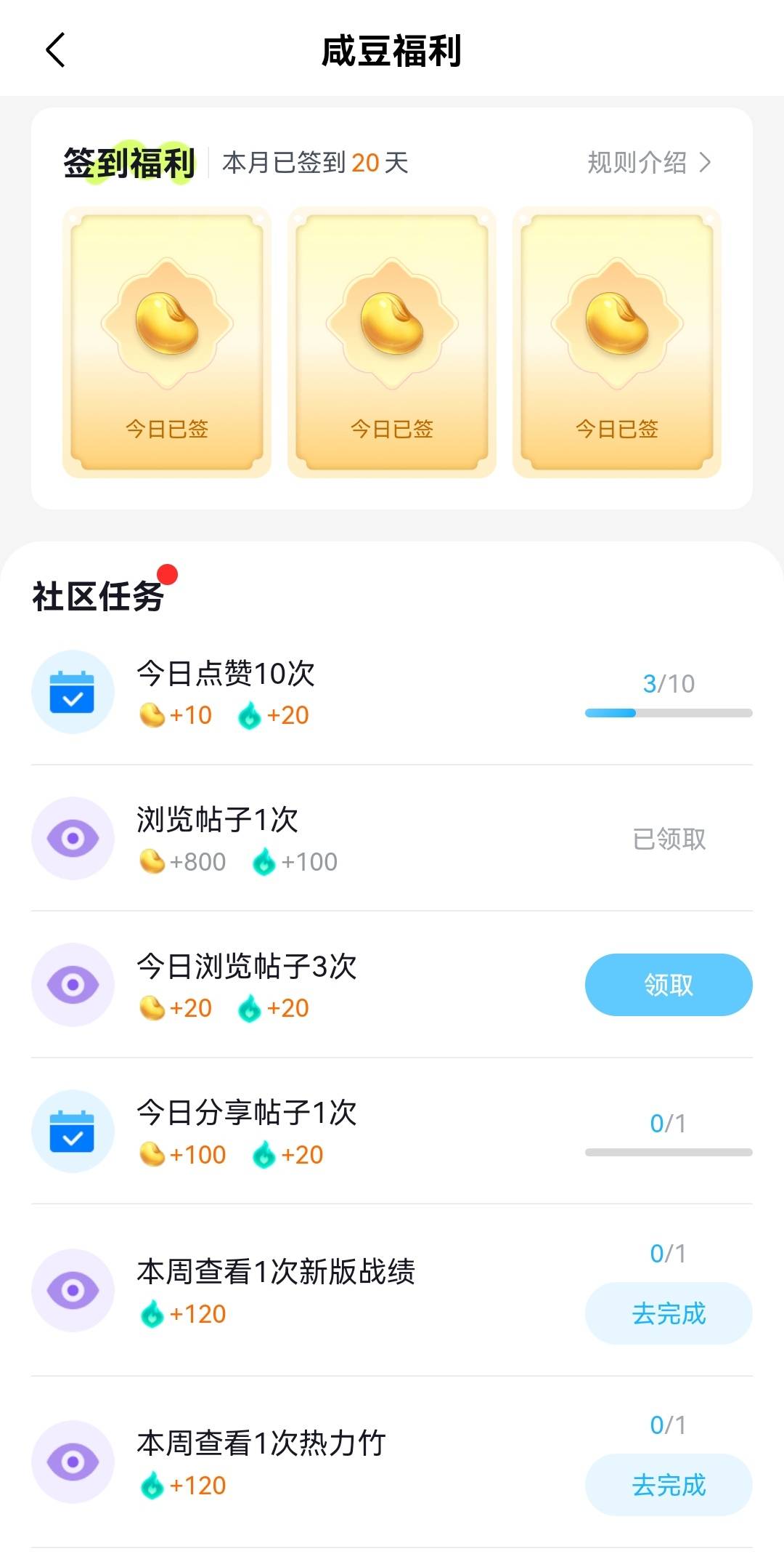 同样是三国咸话APP——签到福利——社区任务,其中有每周任务,随便点几下就能完成,也能获得丰富的热力值,能够加速获取咸豆
