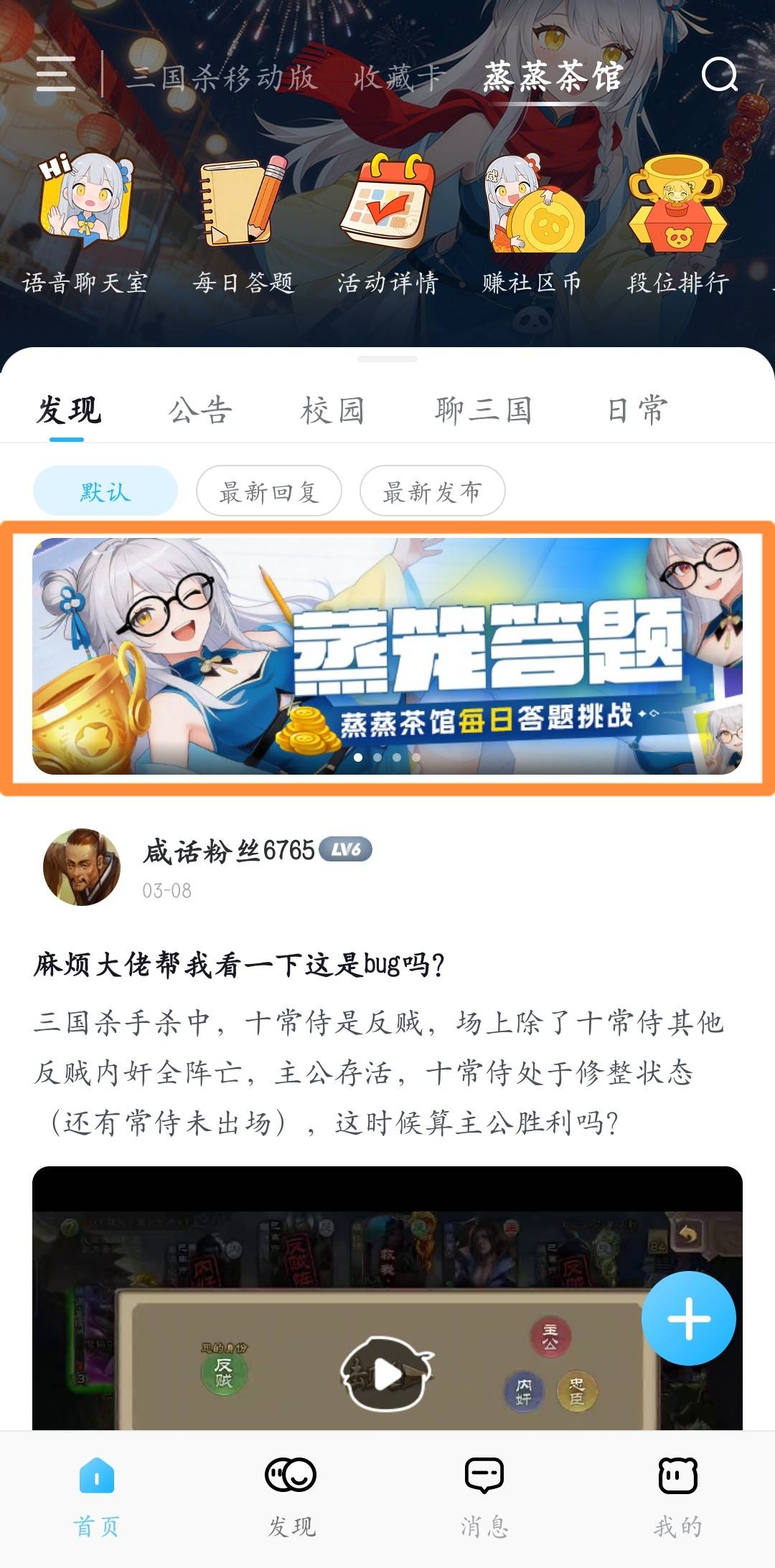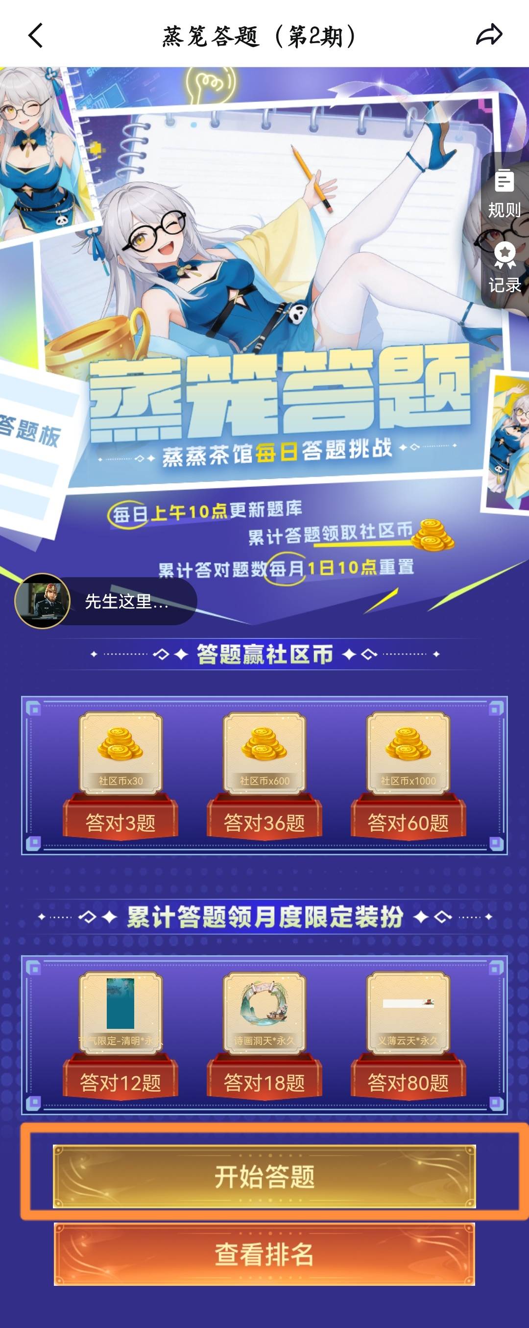 2.进入三国咸话APP——蒸蒸茶馆,点击首页的“蒸笼答题 蒸蒸茶馆每日答题挑战”,点击开始答题即可来到活动页面。答对对应数量的题目即可获取对应奖励。该活动为常驻活动,每天都有答题。答题期间,每日上午10点更新题库,每日更新3题,仅可作答当日题目,已过期题目无法作答,累计答题题数每月1日10点重置
