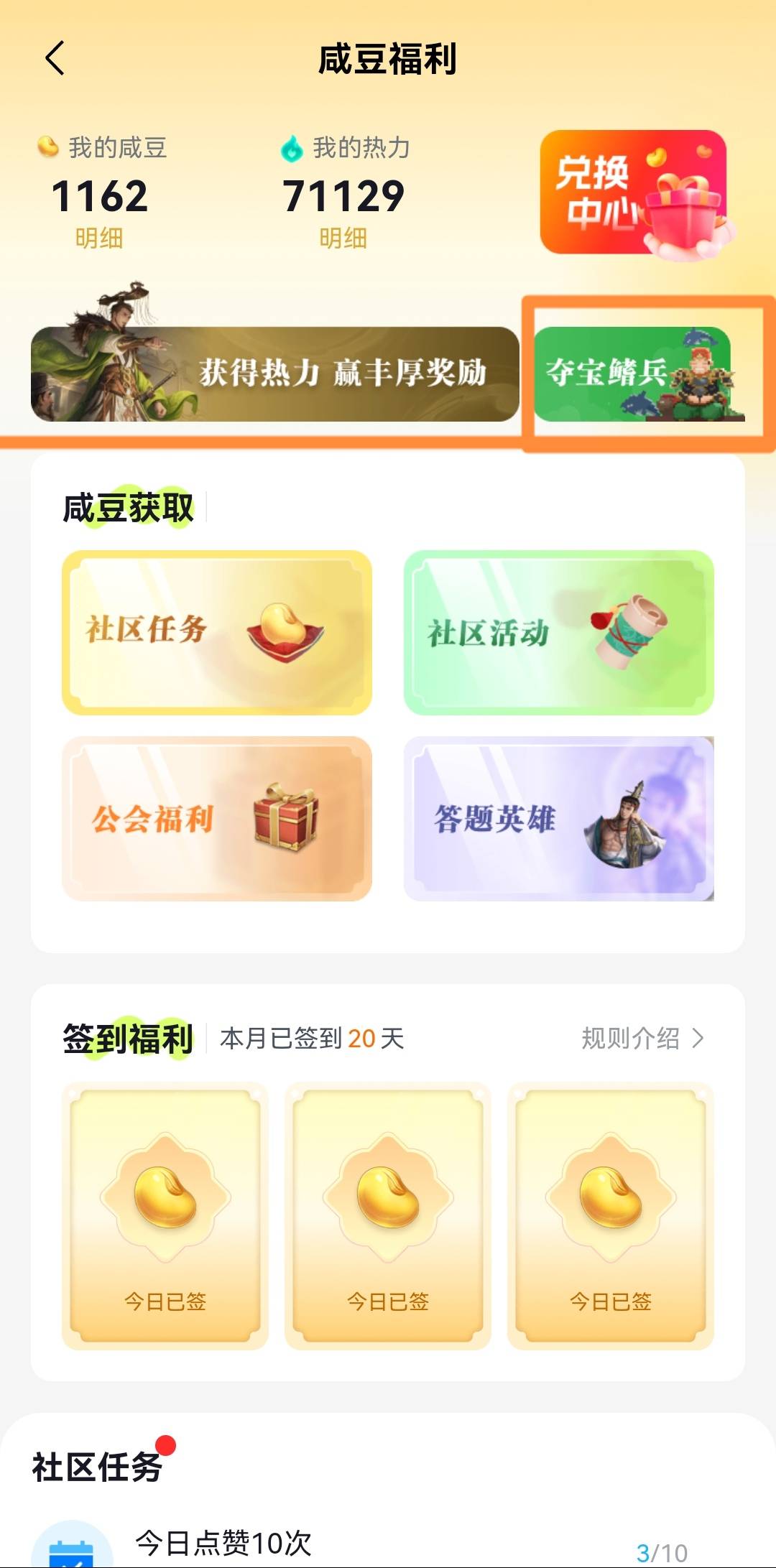 来自版块:三国煮酒1.进入三国咸话APP——签到福利——夺宝鳍兵,完成每周任务后即可获得热力值(任务完成可能会存在延迟,将军们可以多等待一下),能够加速获取咸豆