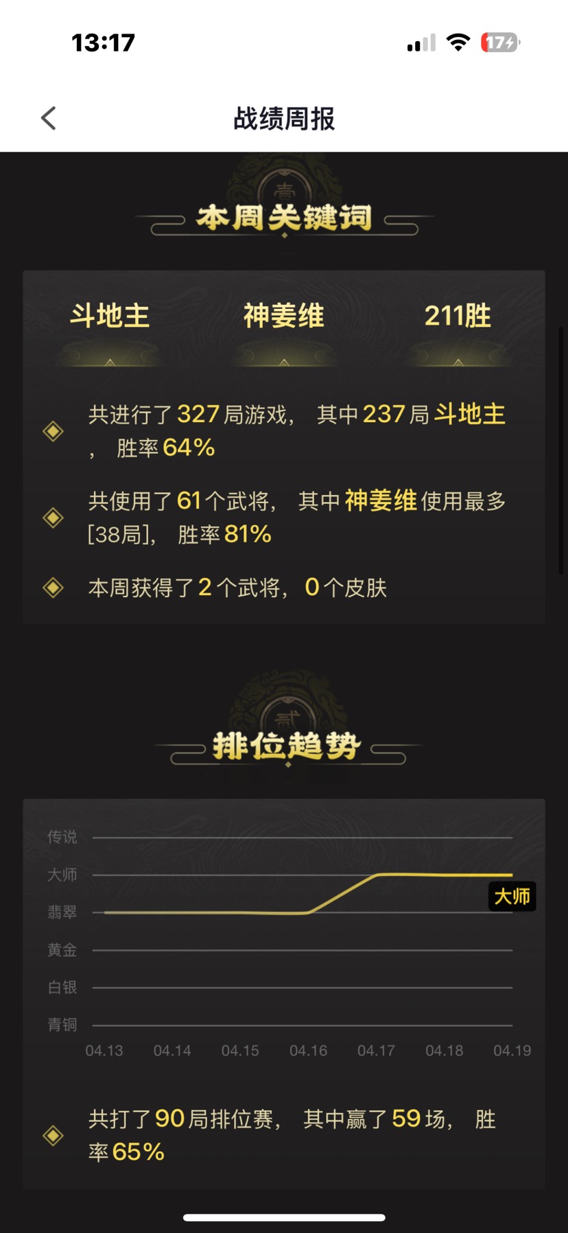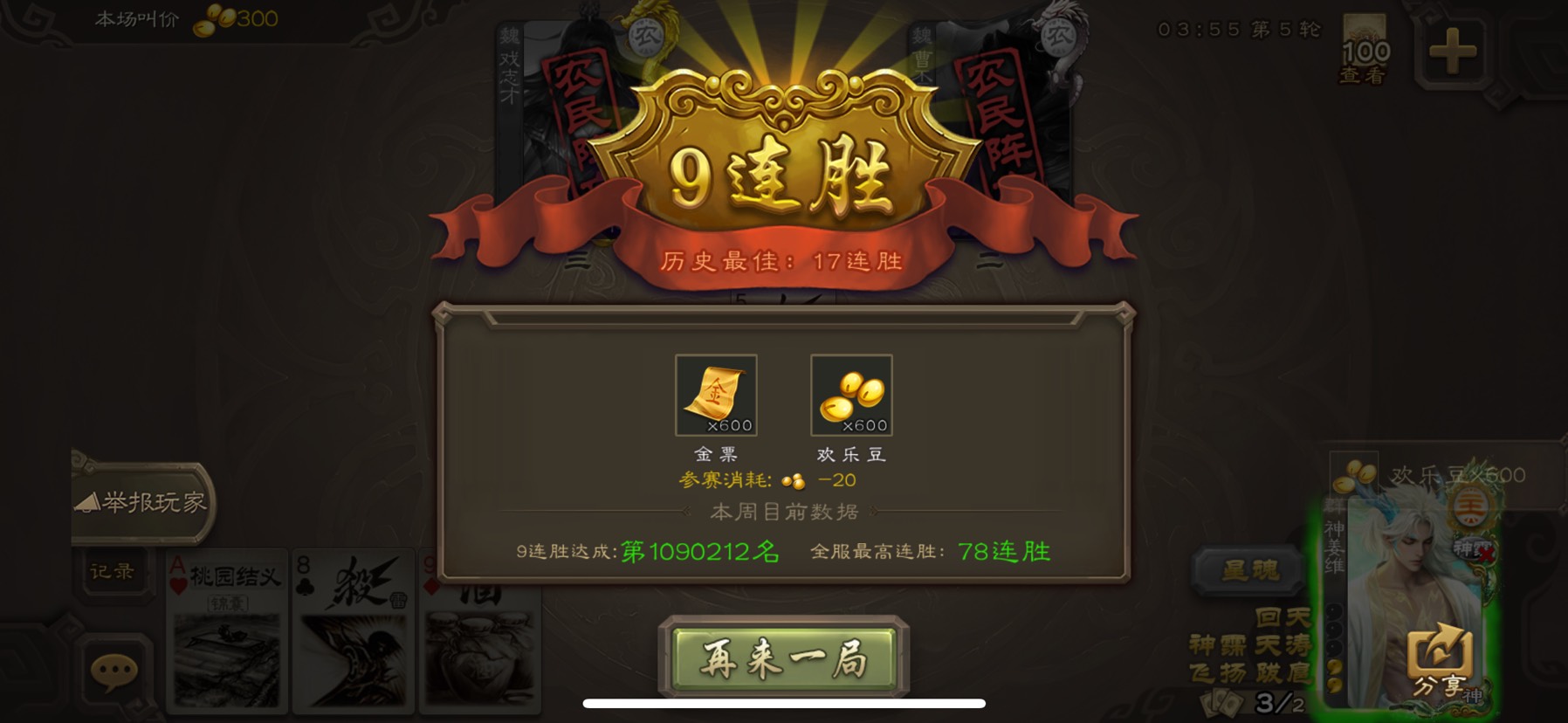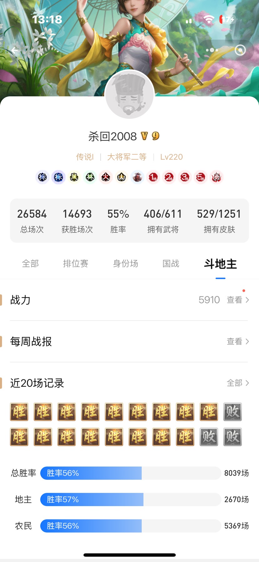 自从抽到了友诸葛,我参考闲话里的大佬,极限禁法(因为之前抽了不少天宫,所以其实强开很多,但不太影响最终结果),发现更上一层楼了,之前5盘有2盘会卡将,现在基本6,7盘才卡一把,体验感更好了,所以如果大家有斗地主前4,前5的话,可以极限禁哈~最近斗地主胜率稳定在6成以上,排位更加不用说啦,每月必上传说~希望不要再出更强力的将了,现在的将面玩斗地主和恶排位都很舒服呀