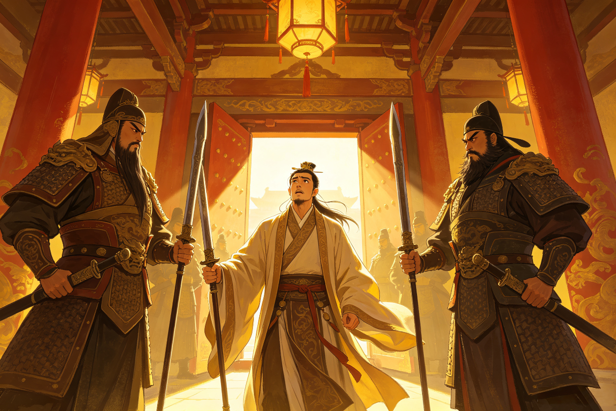 一日朝堂议事,马超入殿后,依旧随口称呼刘备。转头却看见关羽、张飞手持长刀,笔直站在刘备两侧,神情肃穆,并无落座之意。