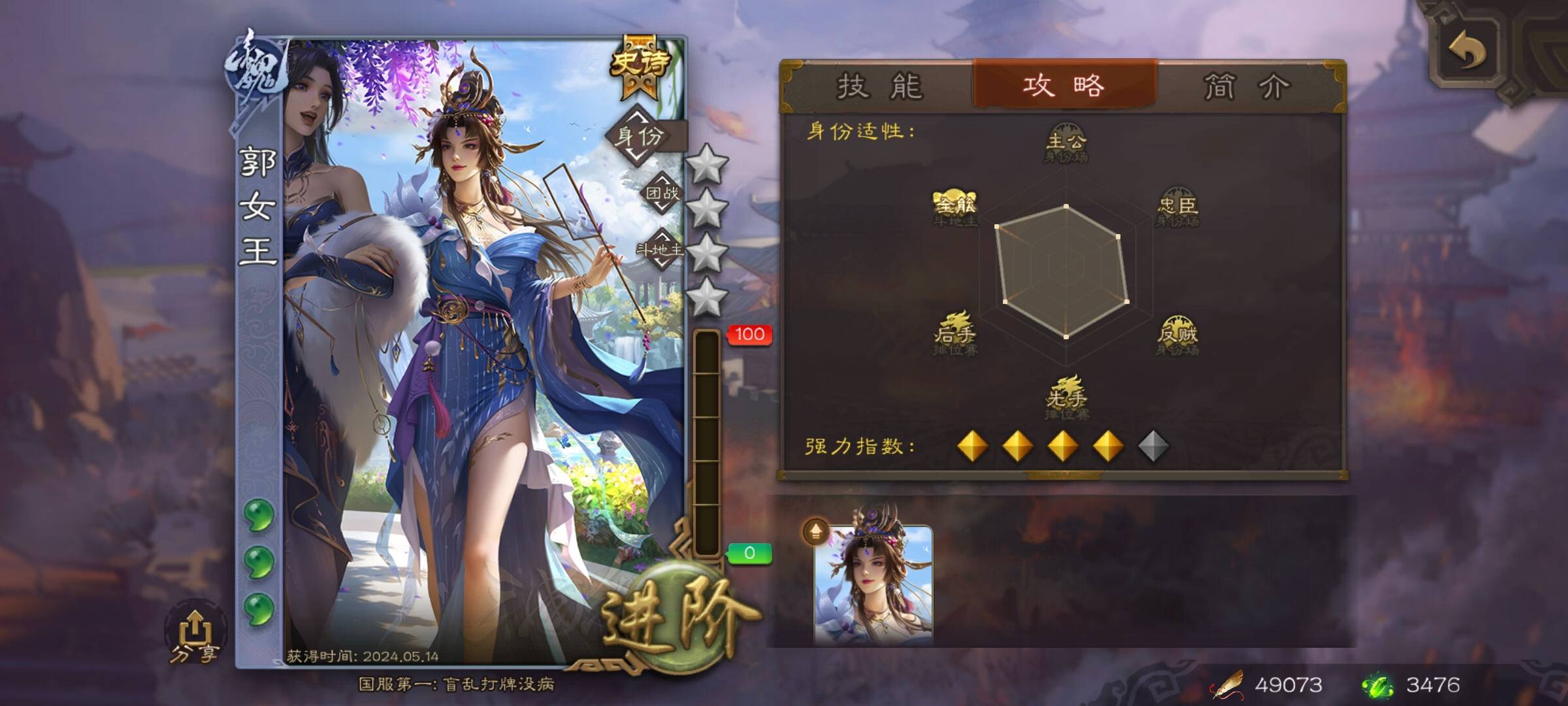 记得过女王上线的时候,和阎象一起,之后看了技能的我觉得,把郭女王放进天宫,把阎象放到宝珠兑换五十珠子,我觉得没什么毛病