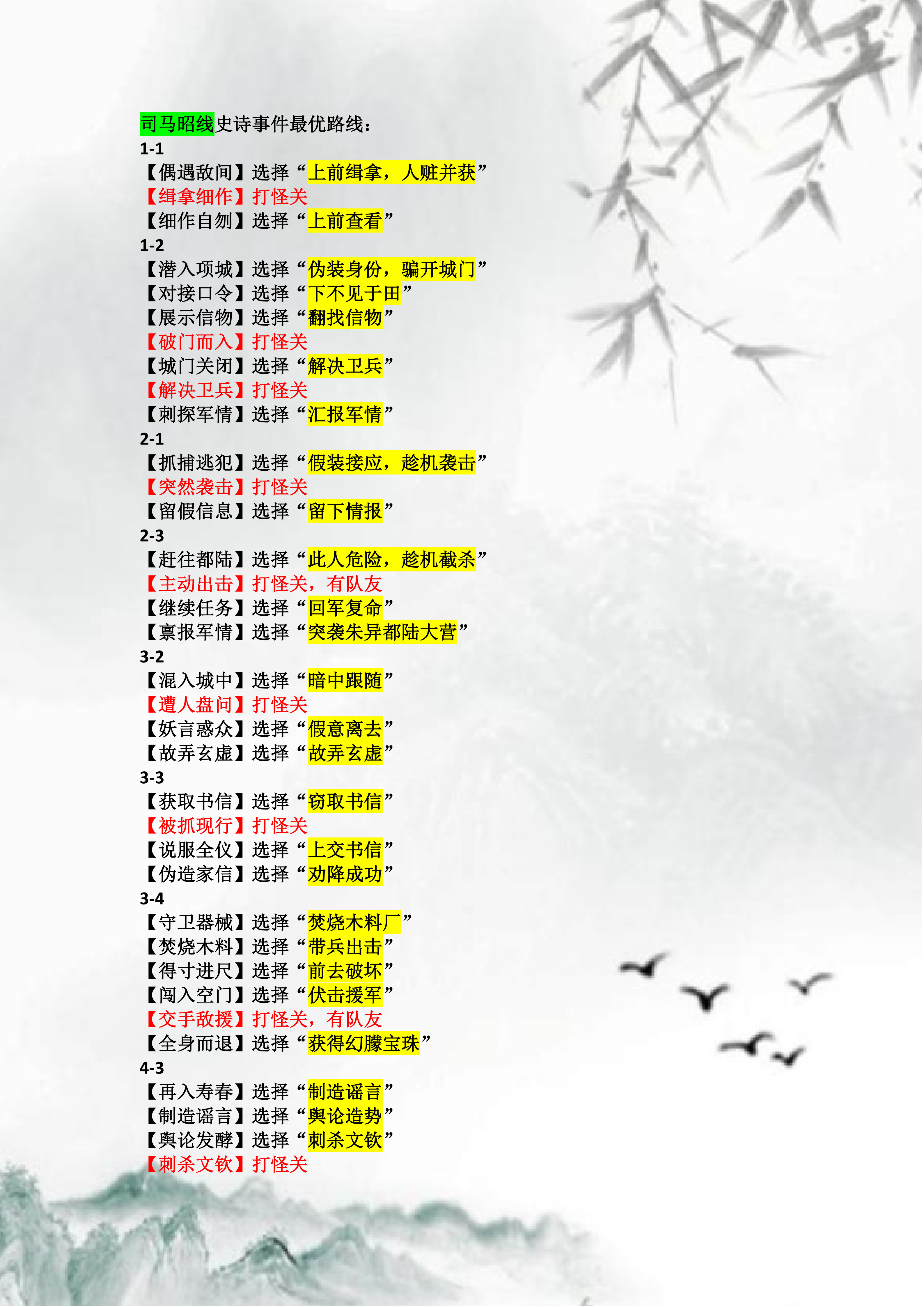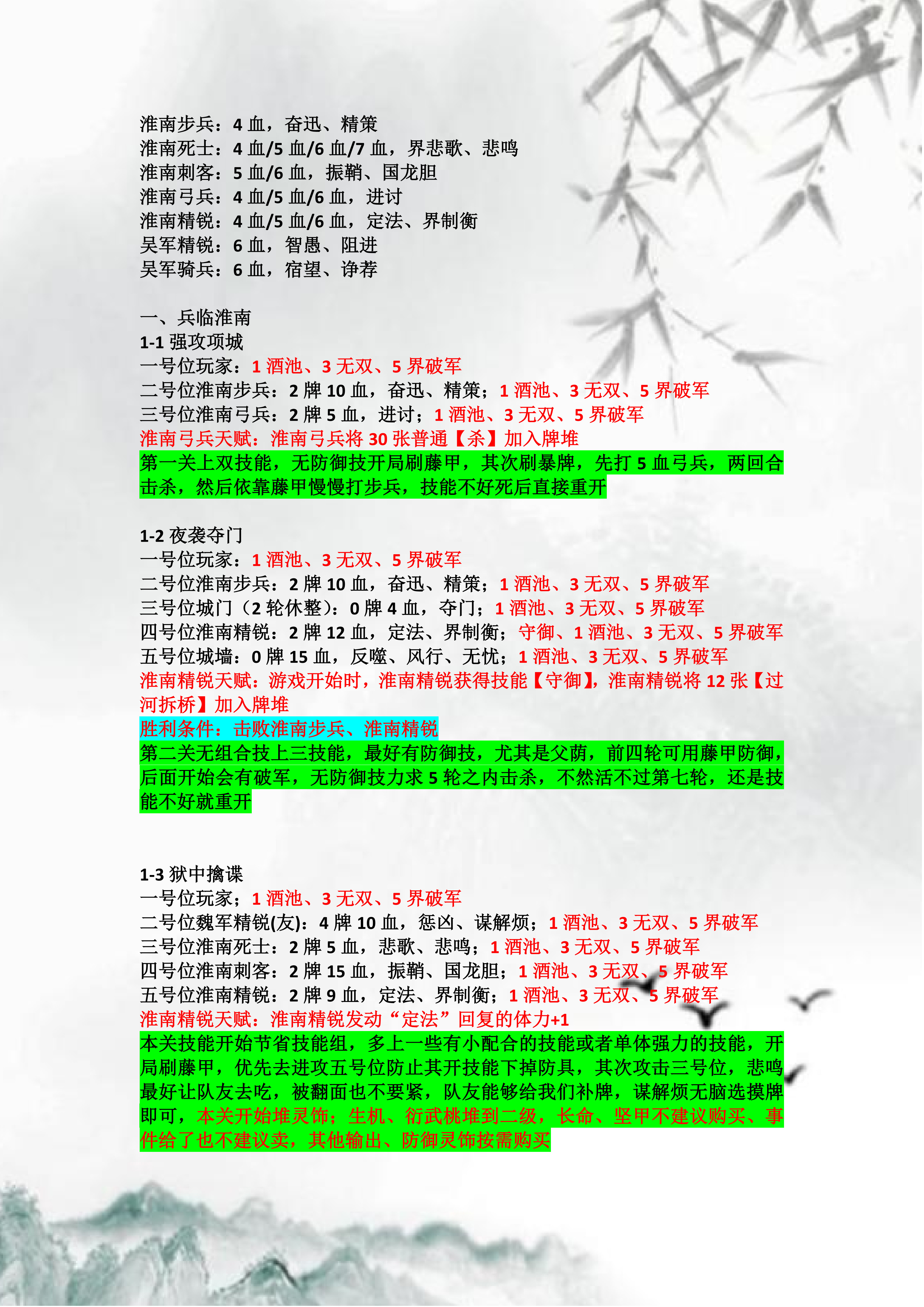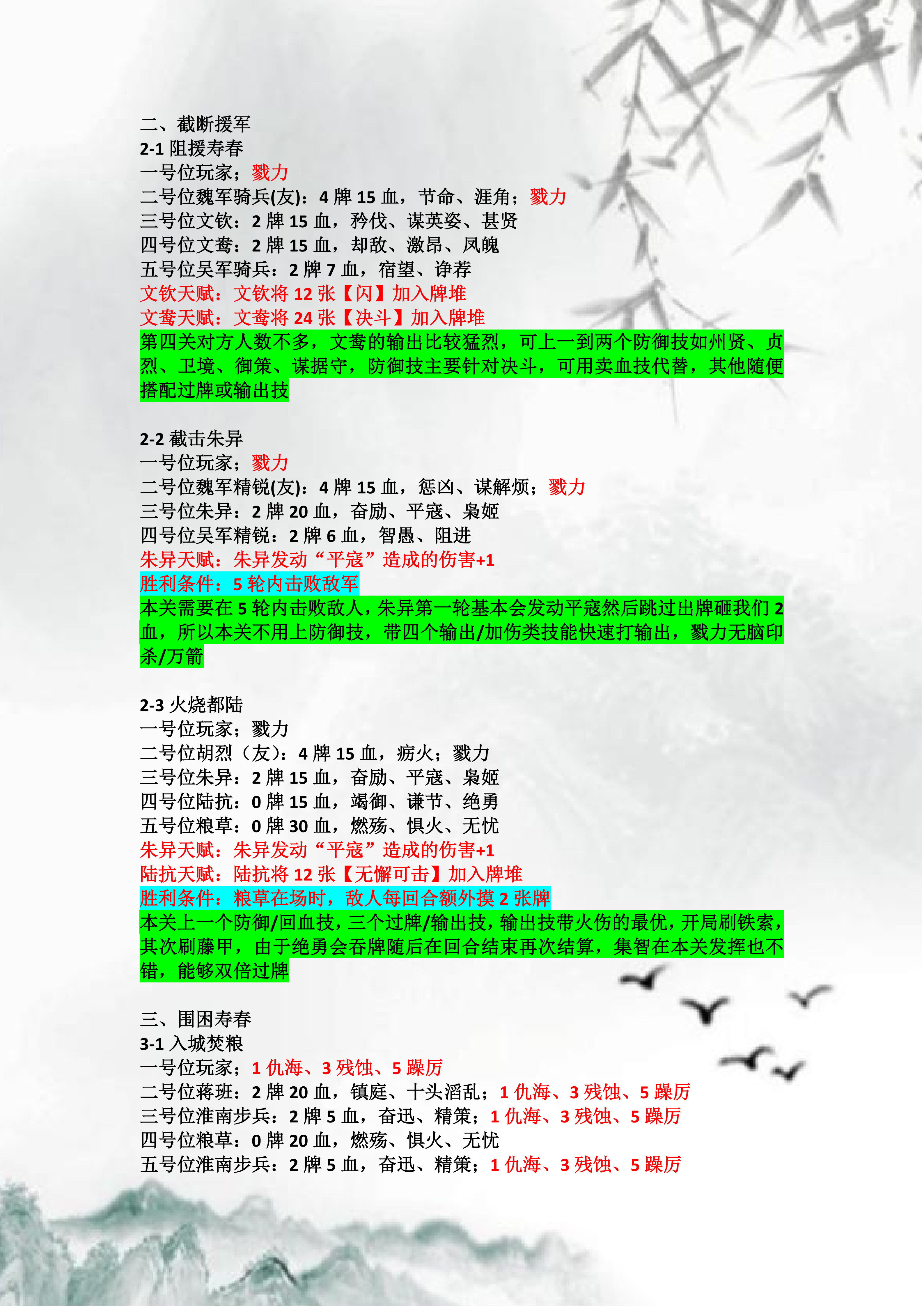 司马昭线的史诗事件比较分散,在前(1-1、1-2)中(3-2、3-3、3-4)后(4-3)都有,而第二章boss难度较小,第三章整体要么是保护、要么是多少轮之内胜利,所以第三章整体是需要抓输出技能的,但这并不意味着不需要抓防御,只是以输出为主,那么过剩的防御/卖血类的技能可以用来应付4-1/4-2,同时可以变卖进行技能调整,好的技能不要一直握在手里,用掉还会刷到的#寿春之战