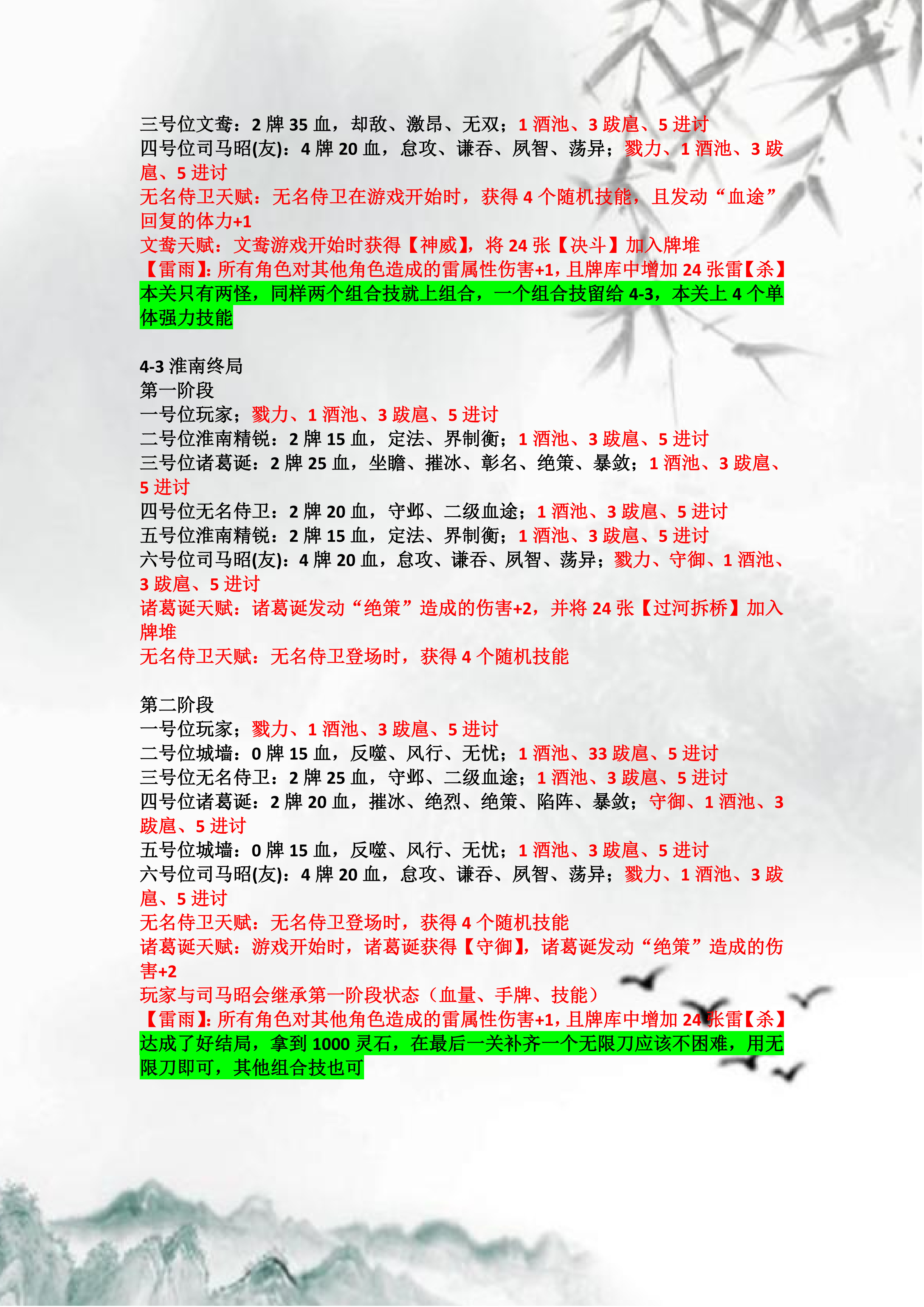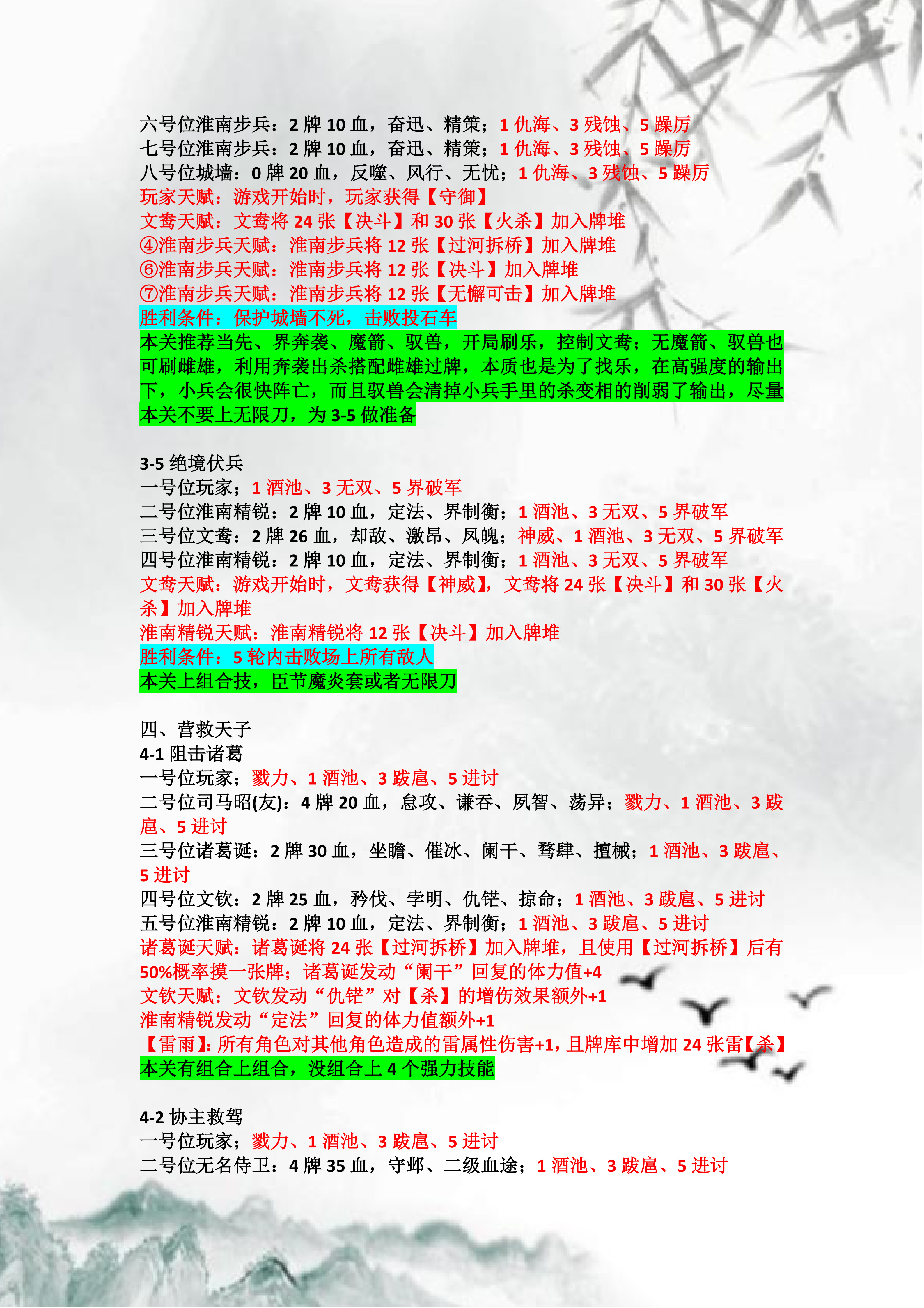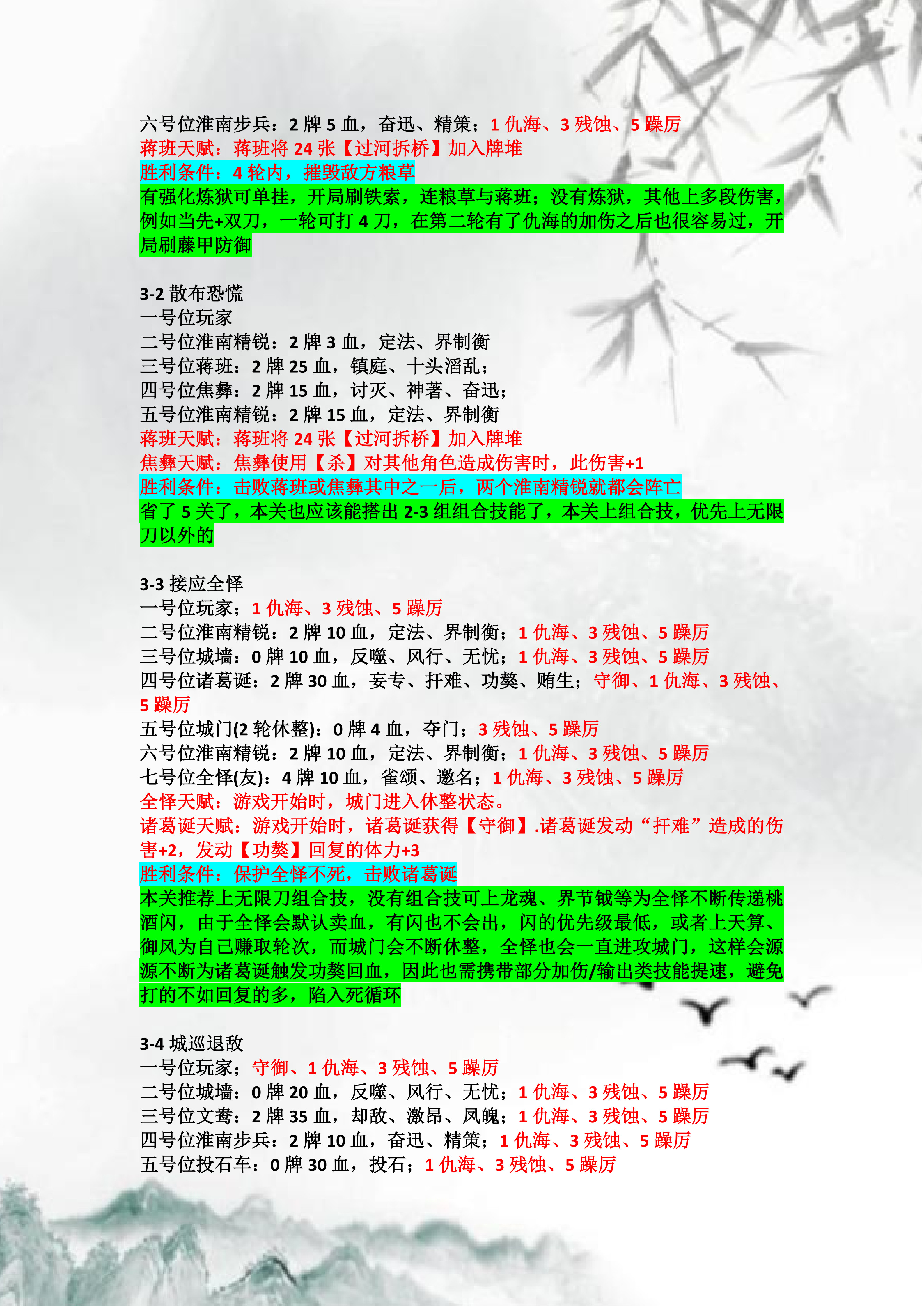 司马昭线的史诗事件比较分散,在前(1-1、1-2)中(3-2、3-3、3-4)后(4-3)都有,而第二章boss难度较小,第三章整体要么是保护、要么是多少轮之内胜利,所以第三章整体是需要抓输出技能的,但这并不意味着不需要抓防御,只是以输出为主,那么过剩的防御/卖血类的技能可以用来应付4-1/4-2,同时可以变卖进行技能调整,好的技能不要一直握在手里,用掉还会刷到的#寿春之战