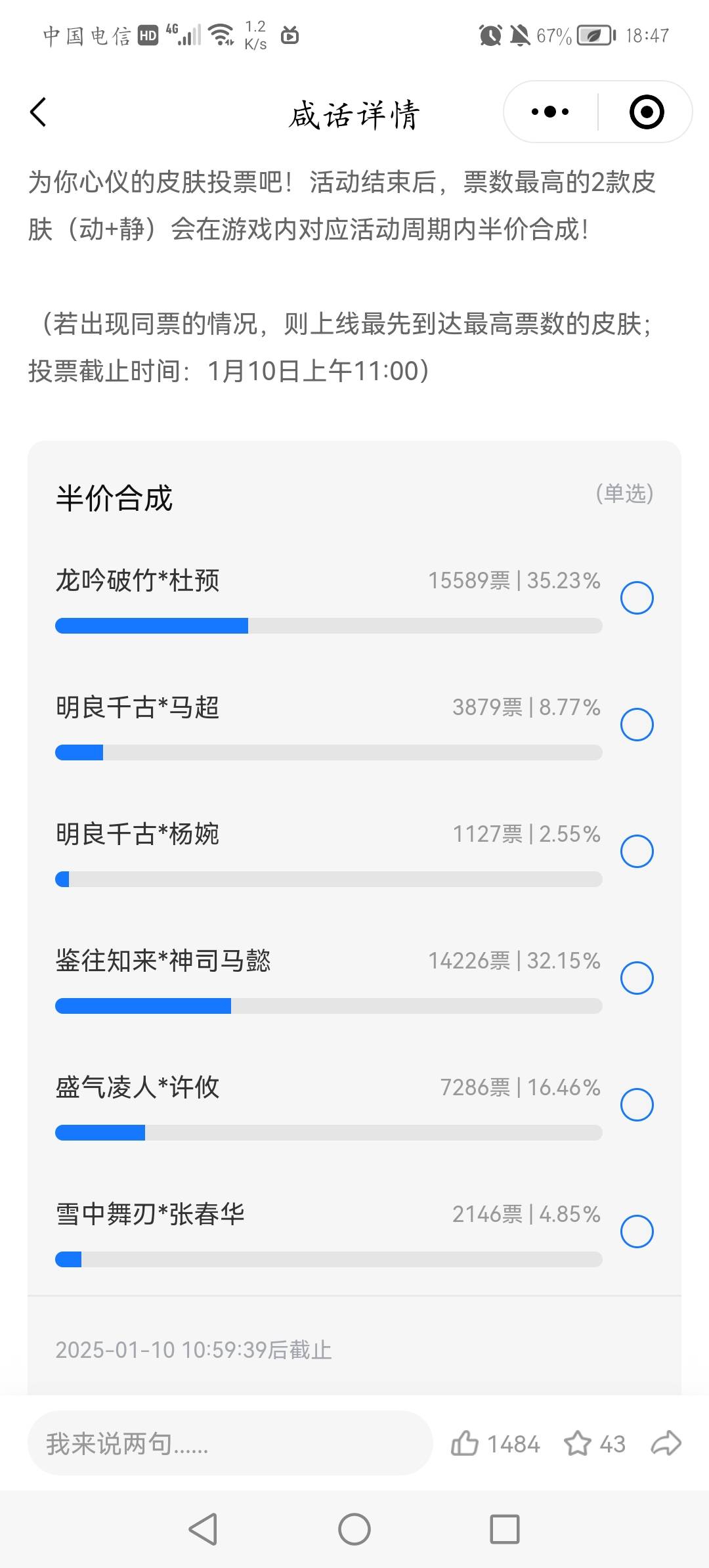再来看皮肤。本期争夺最激烈的就是神司马和杜预的皮肤。个人认为杜预的双形态动皮比神司马好很多。因为他帅,并且上线一年半仅至今没半价过。神司马,皮肤不好看,配音不如原皮,动态效果跟王者荣耀里东皇太一扔三分球差不多。大部分人换了神司马懿的动皮之后也没用过几次,就像上面我说的。质量不如杜预的皮肤。但是神司马相较于杜预来说获取方式简单,玩家持有量大。所以现在说不准。我个人还是投杜预。反正也都换不了。#半价