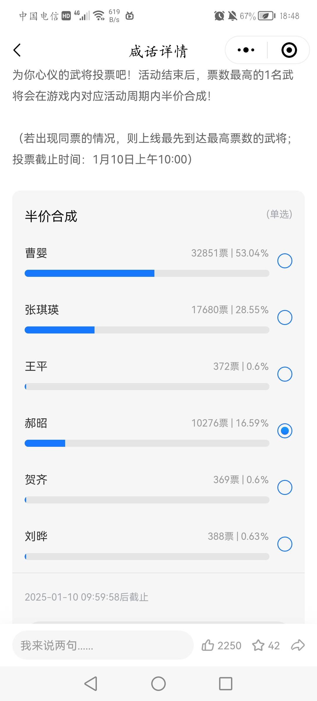 来自版块:三国煮酒先来说武将。曹婴和张琪瑛所需将魂相同,原价都是16666将魂,半价后都是8333将魂。曹婴武将评分8分,张琪瑛武将评分7分。斗地主同理。单挑的话曹婴比张琪瑛强。但张琪瑛有控顶的能力,强度也不低。而且团队作用也比曹婴强。张琪瑛能打排位,评分为6,与界李儒、界廖化、界孙权、崔琰、星徐晃同等评分。而曹婴打不了排位。但是在三国杀移动版中,斗地主人气远高于排位,并且一些其他方面的加成,使得曹婴投票暂时远大于张琪瑛,但基本上也是毋庸置疑了。(我投的郝昭,因为我没将魂。嘿嘿)
